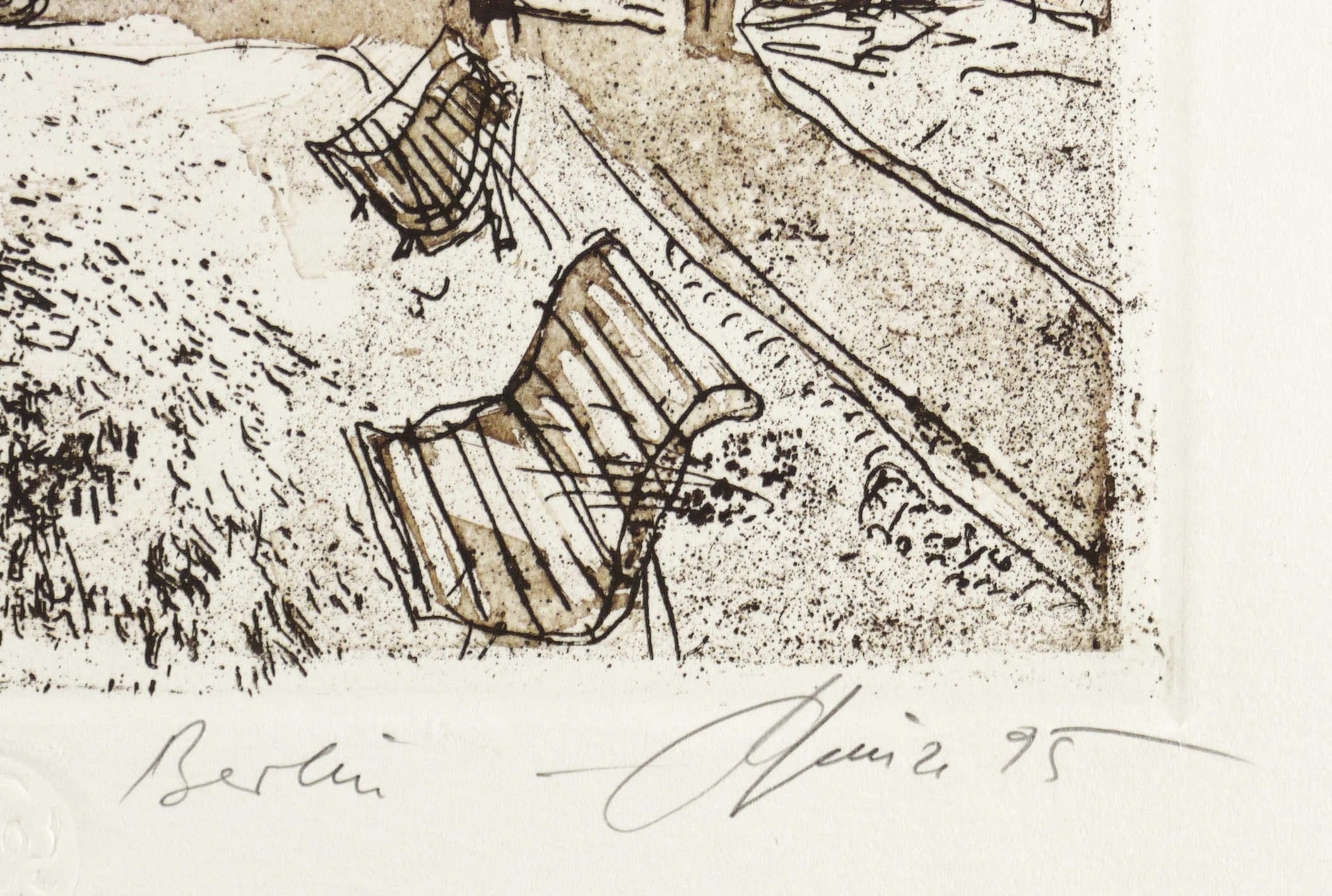 1995. Radierung / Aquatinta & Strichätzung, in Dunkelbraun, auf hellchamois Büttenkarton. – Originale Künstlergrafik, von Christian Heinze. – Auflage Exemplar Nr. 32/60. – 28,8 x 23,1 cm (Darstellung), 29,9 x 24,7 cm (Platte), 53,5 x 38,5 cm (Blatt).