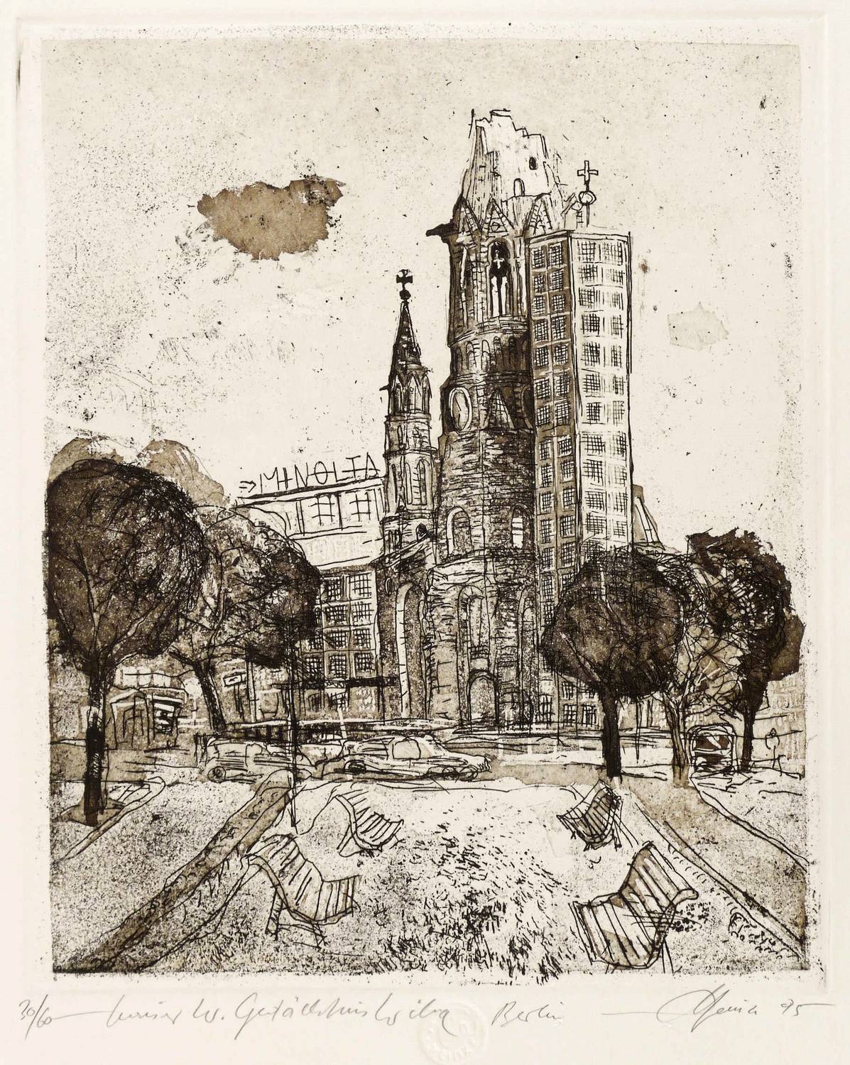 1995. Radierung / Aquatinta & Strichätzung, in Dunkelbraun, auf hellchamois Büttenkarton. – Originale Künstlergrafik, von Christian Heinze. – Auflage Exemplar Nr. 30/60. – 28,8 x 23,1 cm (Darstellung), 29,9 x 24,7 cm (Platte), 53,5 x 38,5 cm (Blatt).