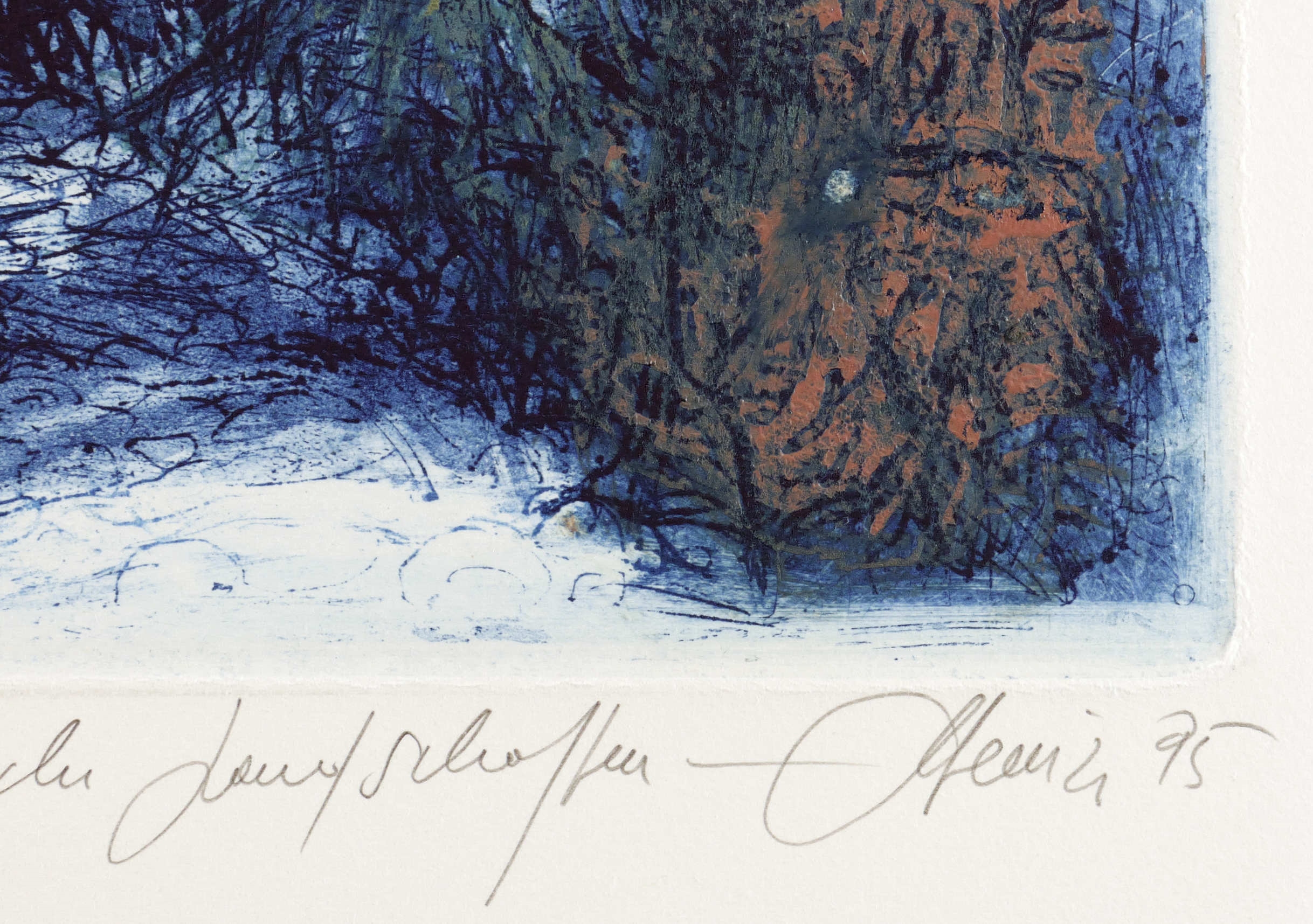 Rechts unten in Bleistift signiert und datiert. Links Auflagenbezeichnung und Titel. Dazu Prägestempel des Künstlers. – Christian Heinze wandelt die Anlage der Farben bei jedem Druckvorgang so ab, dass man von unikaten Farbvarianten sprechen kann. – Sehr guter Zustand.