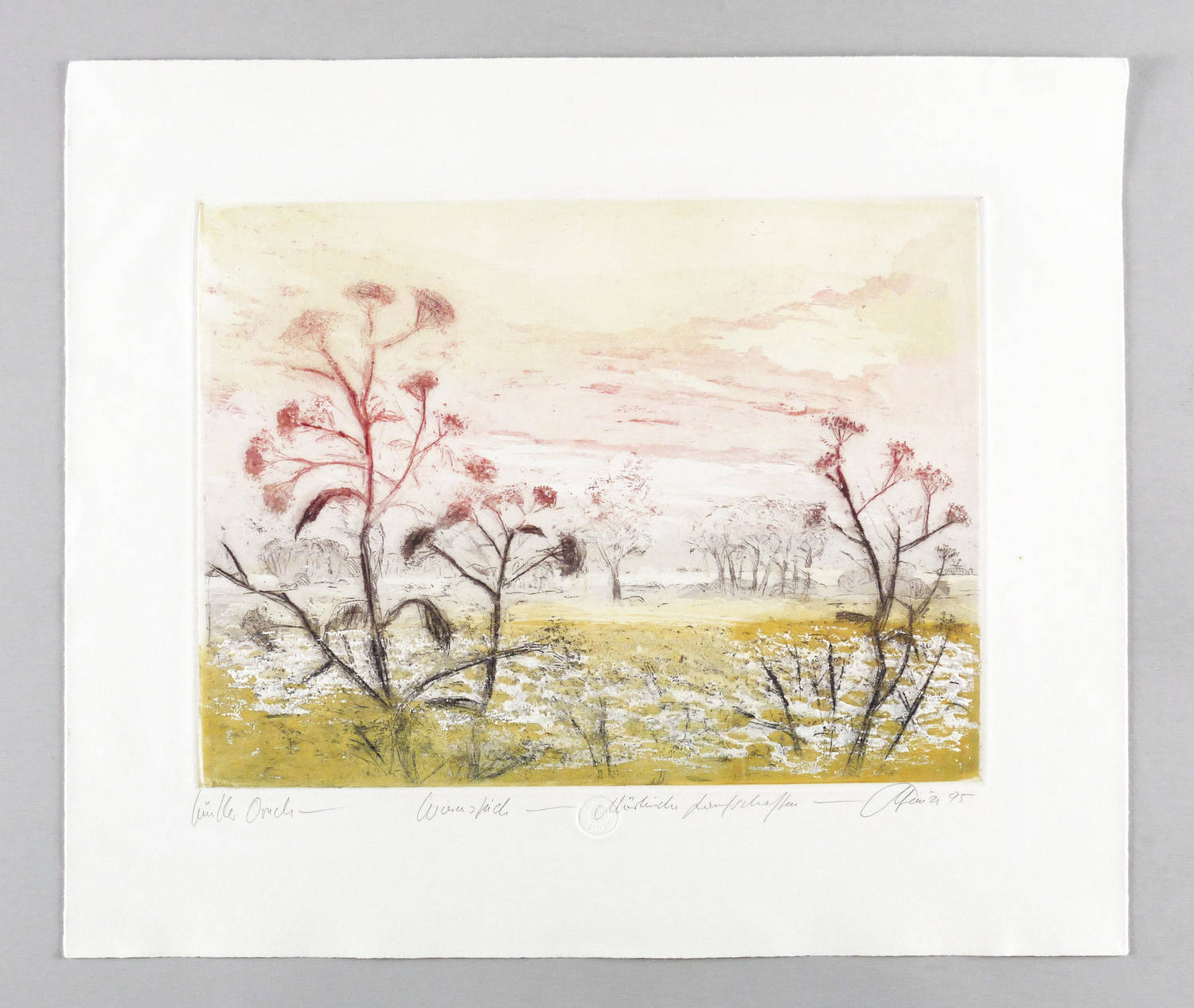 1995. Farbradierung / Aquatinta, Reservage & Strichätzung, in 4 Farben, auf weißem Büttenkarton. – Originale Künstlergrafik, von Christian Heinze. – Unikate Farbvariante. – 30,50 x 40,2 cm (Darstellung / Platte), 46 x 54,5 cm (Blatt).
