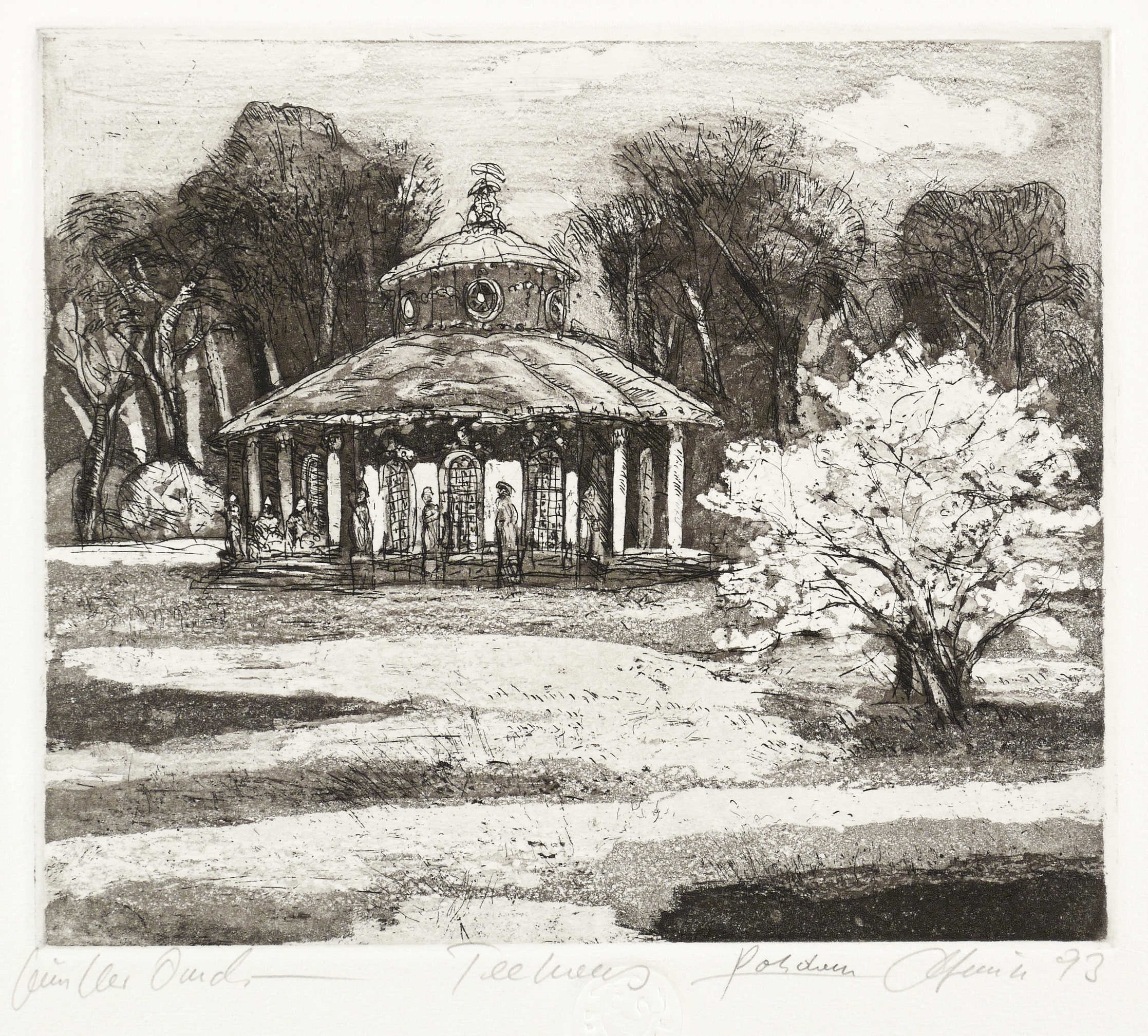 1993. Radierung / Aquatinta & Strichätzung, in Schwarz, auf hellgelbem Büttenkarton. – Originale Künstlergrafik, von Christian Heinze. – Künstlerexemplar (e.a.). – 16,5 x 19,5 cm (Darstellung / Platte), 26 x 27 cm (Blatt).