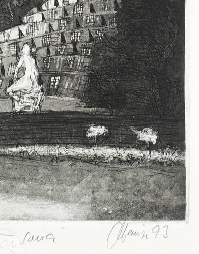 1993. Radierung / Aquatinta & Strichätzung, in Schwarz, auf hellgelbem Büttenkarton. – Originale Künstlergrafik, von Christian Heinze. – Künstlerexemplar (e.a.). – 17,0 x 19,8 cm (Darstellung / Platte), 32 x 27 cm (Blatt).