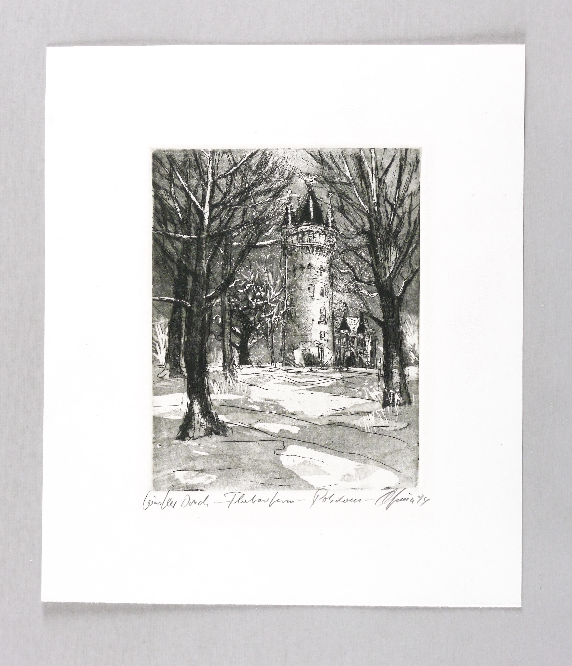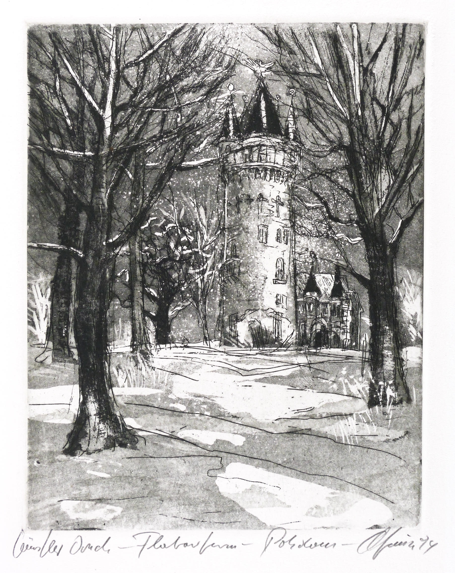 Rechts unten in Bleistift signiert und datiert. Links Auflagenbezeichnung. Mittig Titel. – Anstelle der 1848 abgebrannten holländischen Windmühle 1853-56 errichteter bewohnbarer Turm nach dem Vorbild des Eschenheimer Torturms in Frankfurt am Main (15. Jh.). – Blatt um die Darstellung schwach lichtrandig. Sonst guter Zustand.