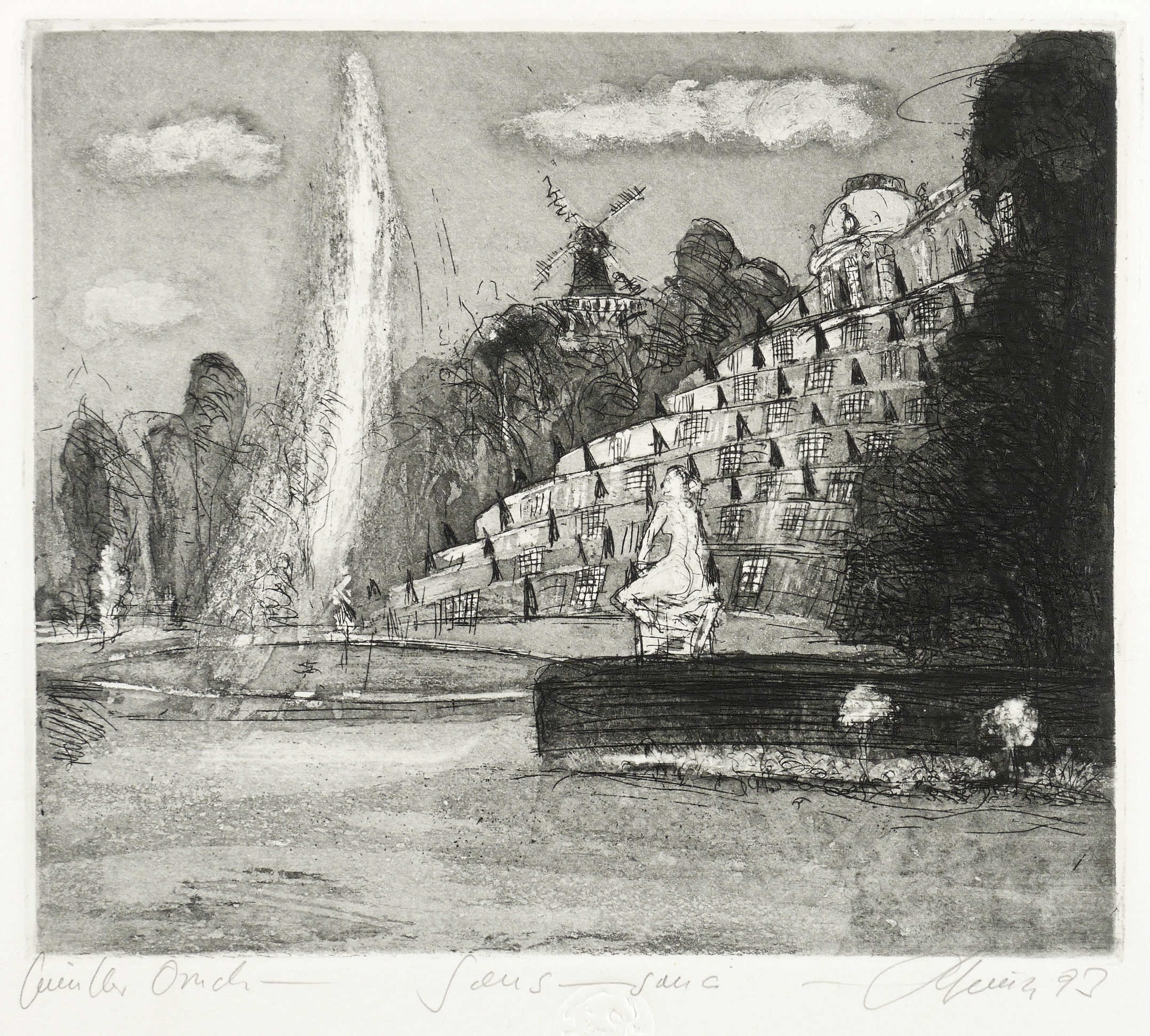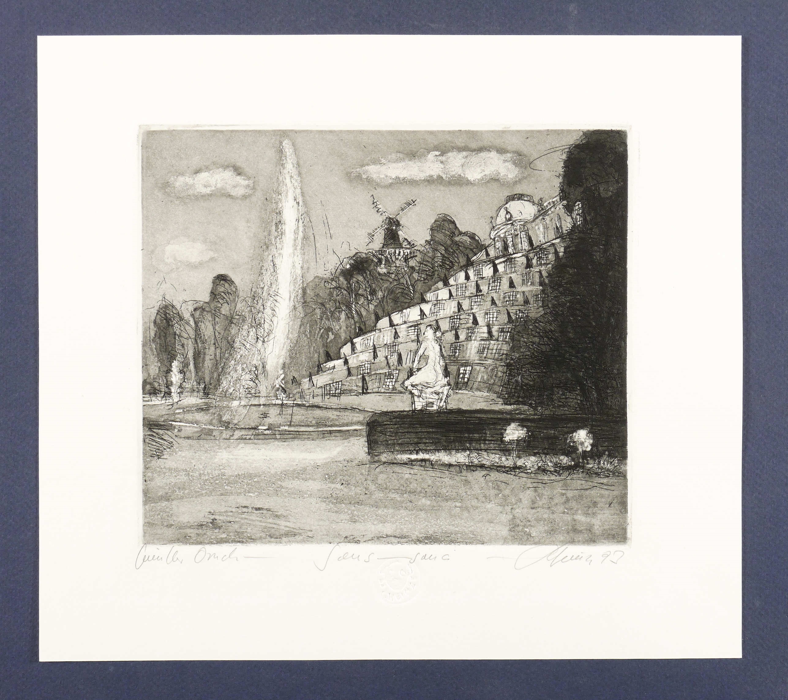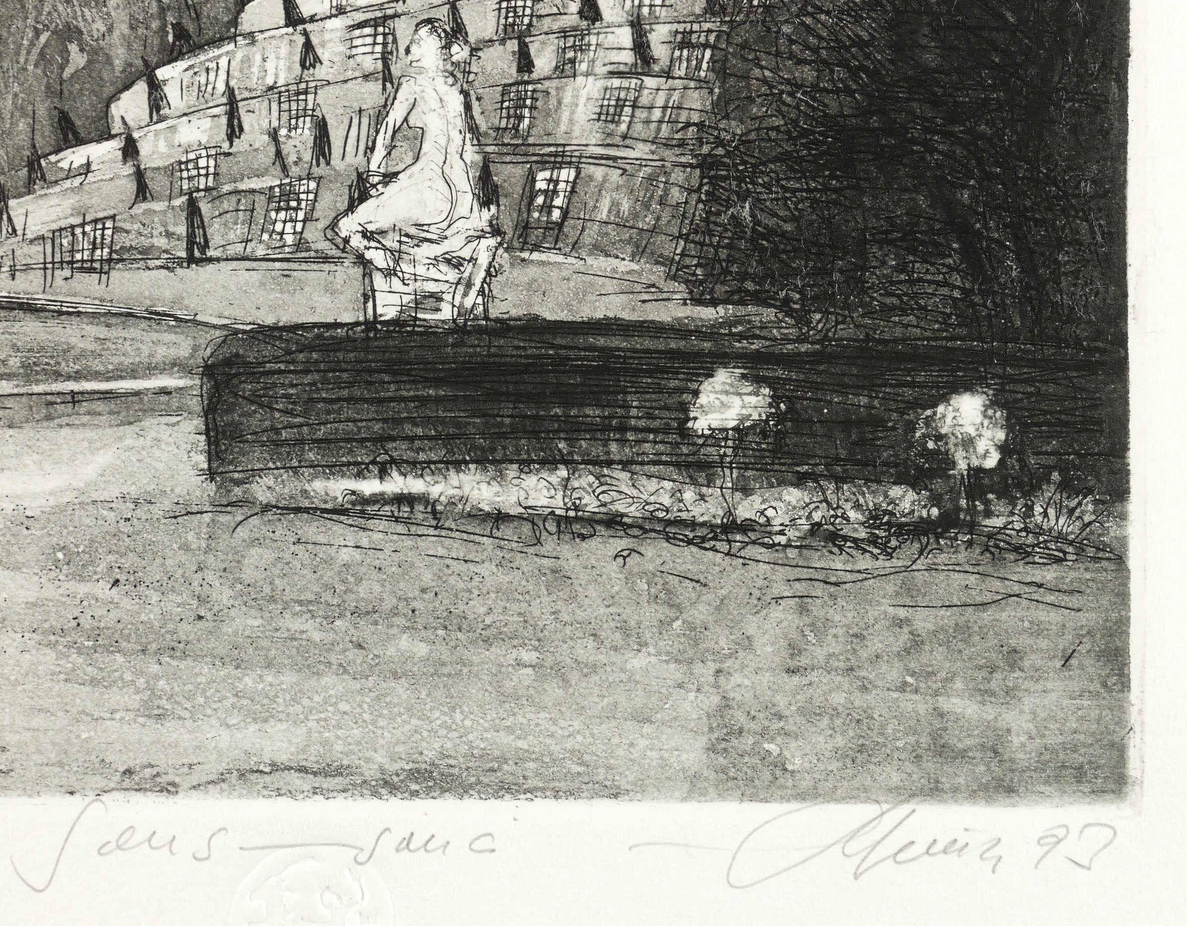 1993. Radierung / Aquatinta & Strichätzung, in Schwarz, auf hellem Büttenkarton. – Originale Künstlergrafik, von Christian Heinze. – Künstlerexemplar (e.a.). – 17,0 x 19,8 cm (Darstellung / Platte), 25 x 28 cm (Blatt).