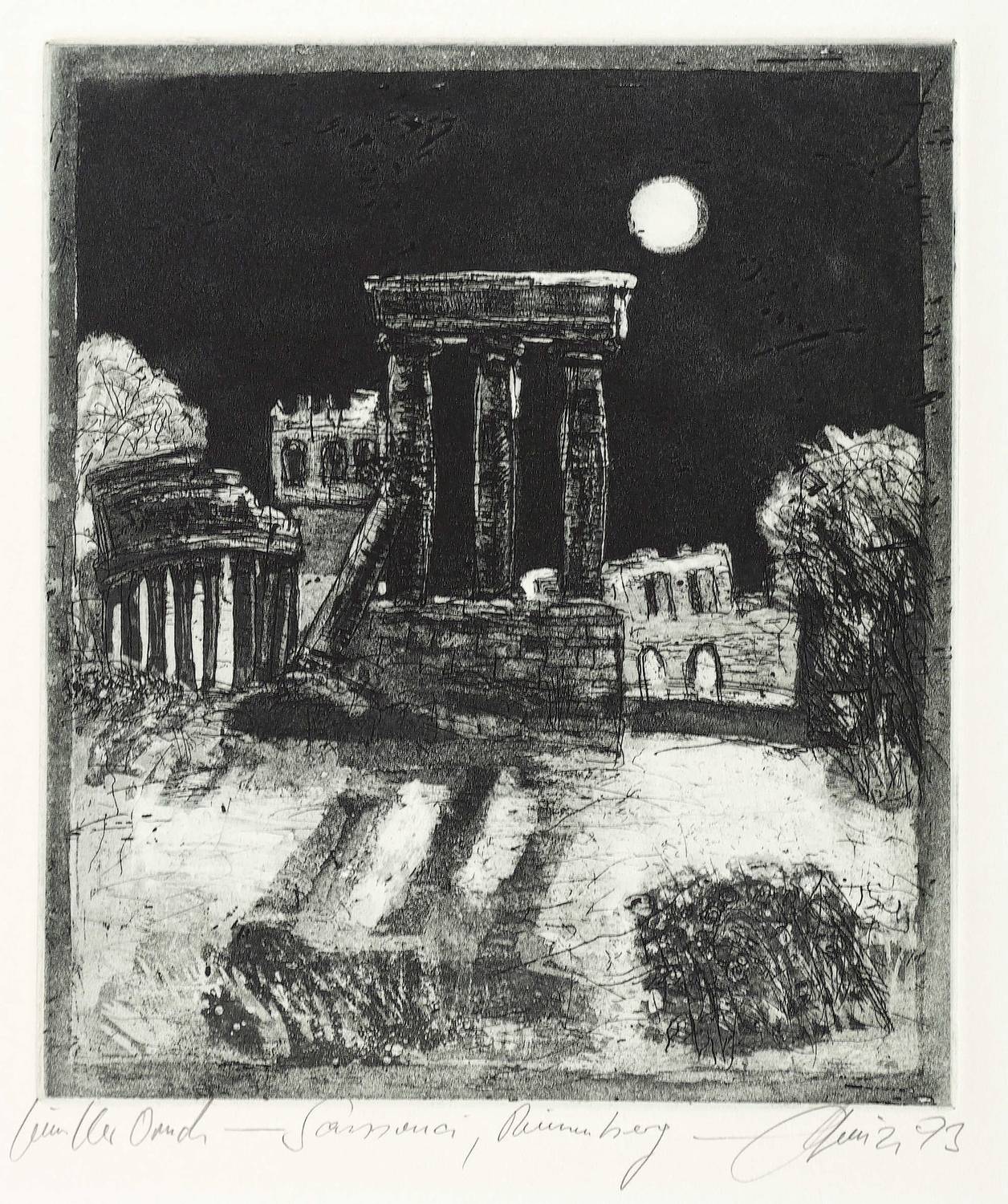 1993. Radierung / Aquatinta & Strichätzung, in Schwarz, auf hellem Büttenkarton. – Von Christian Heinze. – Künstlerexemplar (e.a.). – 20,7 x 17,8 cm (Darstellung / Platte), 37,5 x 28,5 cm (Blatt).