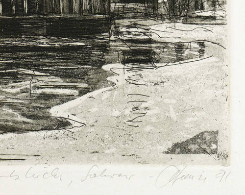 Rechts unten in Bleistift signiert und datiert. Links Auflagenbezeichnung. Mittig Titel. Am unteren Blattran Trockenstempel des Künstlers. – Sehr guter Zustand.