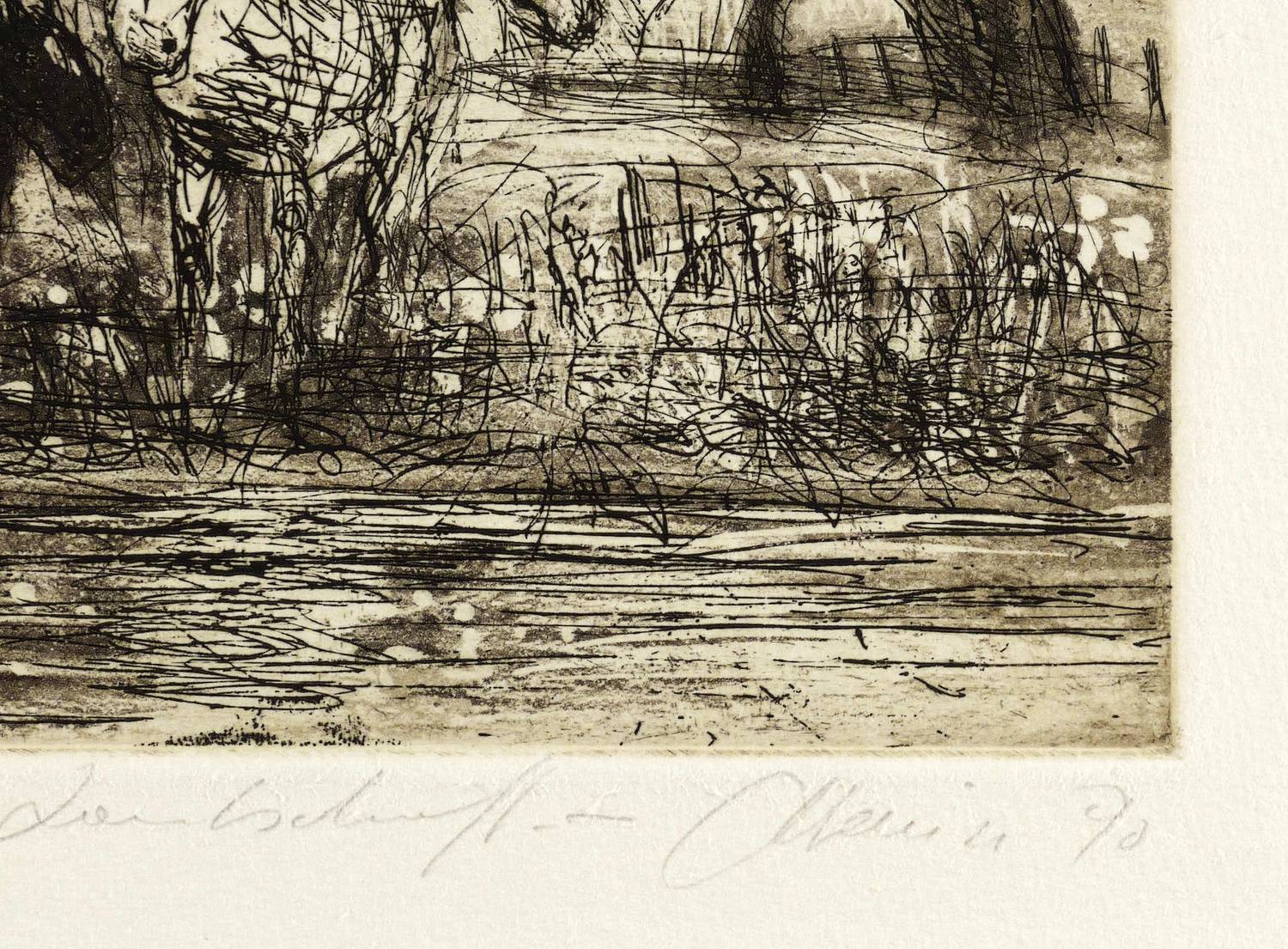 1990. Radierung / Aquatinta & Strichätzung, in Schwarzbraun, auf hellgelbem Büttenpapier. – Von Christian Heinze. – Auflage Exemplar Nr. 12/30. – 20,7 x 17,3 cm (Darstellung / Platte), 39,5 x 31,5 cm (Blatt).
