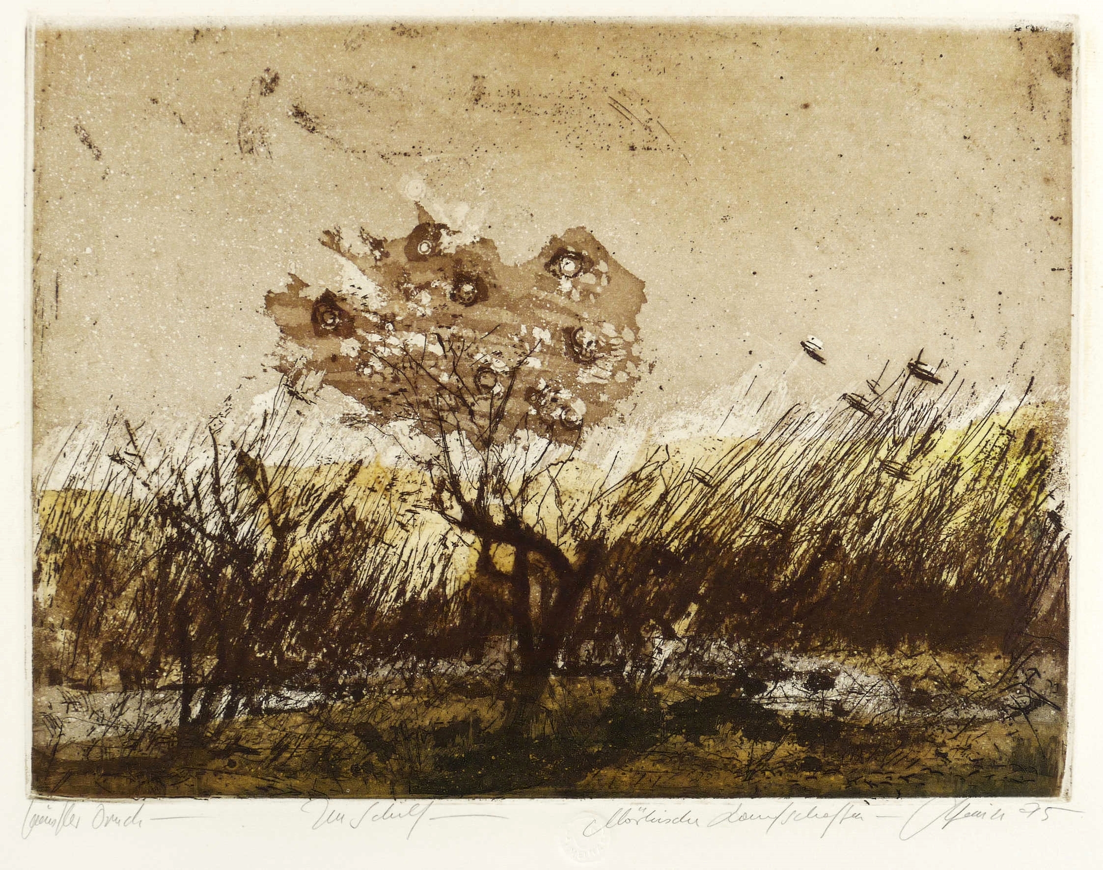 1995. Farbradierung / Aquatinta & Reservage, in Braun, Ocker & Schwarz, auf schwerem Hahnemühle-Bütten. – Von Christian Heinze. – Unikate Farbvariante. – 30,3 x 40,8 cm (Darstellung / Platte), 44,5 x 60,5 cm (Blatt).