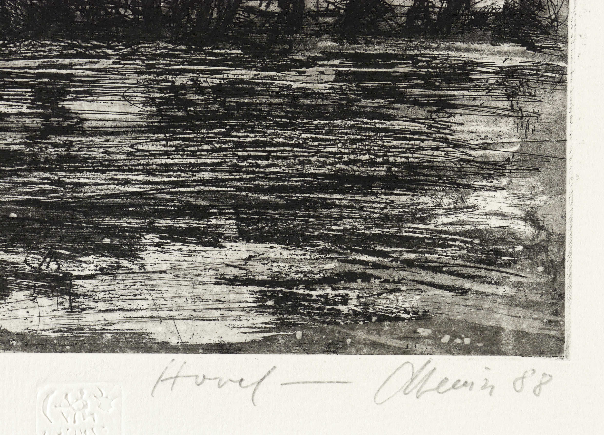 1988. Radierung / Aquatinta & Strichätzung, in Schwarz, auf hellem Büttenkarton. – Von Christian Heinze. – Auflage Exemplar Nr. 15/100. – 20,6 x 17,7 cm (Darstellung / Platte), 38 x 26 cm (Blatt).