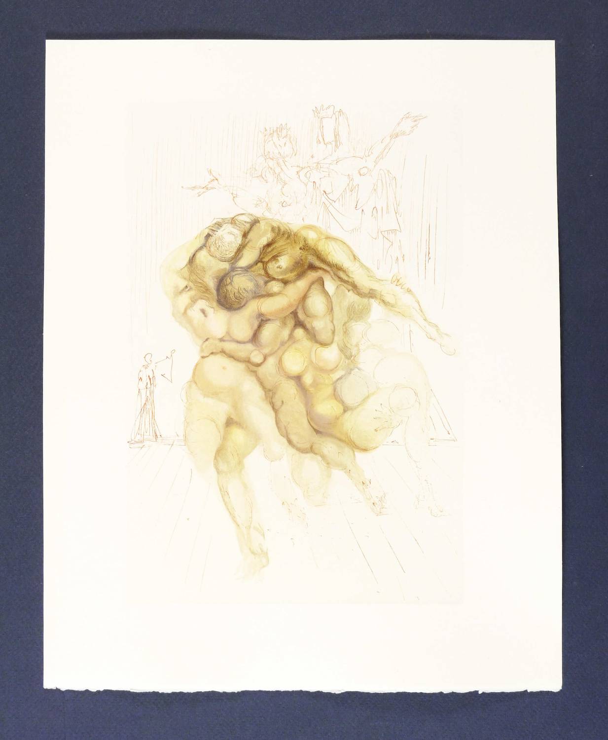 Michler-Löpsinger 1046. – Nicht handsigniert. – Originale Druckgrafik für das monumentale Illustrationswerk zu Dantes Göttlicher Komödie. Salvador Dali zog für die Herstellung der vielen Druckstöcke Raymont Jacquet und Jean Tarico hinzu. Die Buchausgabe erschien 1959-63 bei Les Heures Claires (Paris) in 6 Bänden. – Es existieren keine handsignierten Exemplare dieses Holzschnitts. – Tadellos erhalten. Sehr guter Zustand.