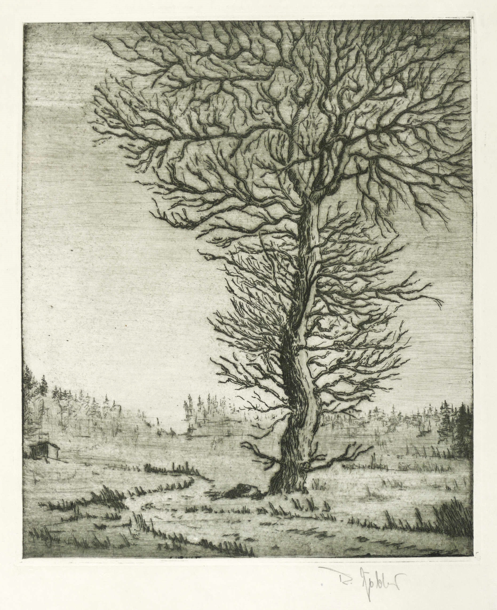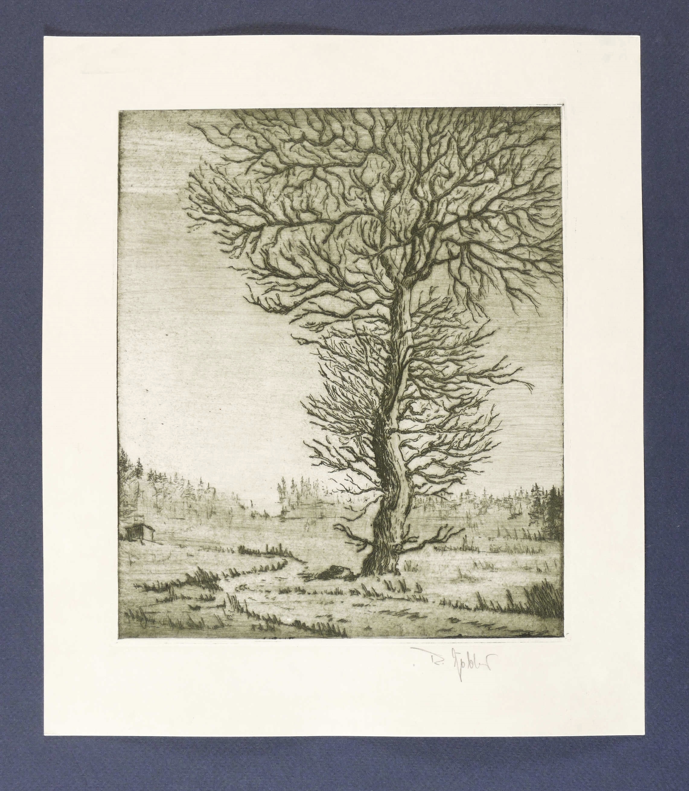 Um 1960. Radierung / Kaltnadel, in Schwarzgrün, mit Plattenton, auf glattem Büttenkarton. – Originale Künstlergrafik, von Rudolf Göbler. – 23,8 x 20,0 cm (Darstellung), 24,5 x 20,5 cm (Platte), 32 x 27 cm (Blatt).