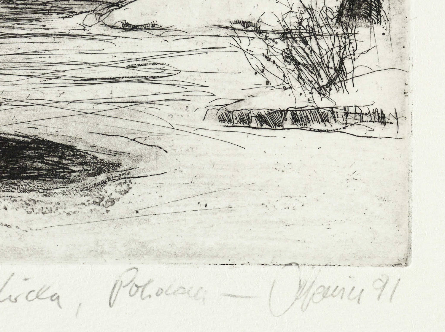 1991. Radierung / Aquatinta & Strichätzung, in Schwarz, auf hellchamois Büttenkarton. – Originale Künstlergrafik, von Christian Heinze. – Künstlerexemplar (e.a.). – 18,9 x 16,1 cm (Darstellung / Platte), 38 x 31 cm (Blatt).