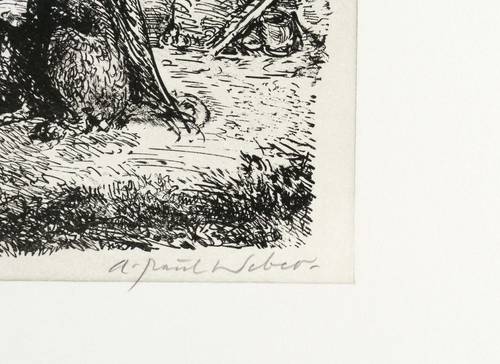 Andreas Paul Weber (1893 Arnstadt - 1980 Schretstaken / Mölln). Oft auch A. Paul Weber. Deutscher Lithograf, Zeichner und Grafiker. Schüler der Kunstgewerbeschule Erfurt. Erste autodidaktische Versuche in Lithografie. Im 1. Weltkrieg Soldat an der Ostfront. 1916 als Zeichner und Karikaturist bei der Zeitschrift der 10. Armee tätig und 1918 nach Spa versetzt. Gehörte dem nationalrevolutionären Kreis um Ernst Niekisch an. Wurde deshalb 1937 ein halbes Jahr inhaftiert. Zeichnete auch antisemitische Karikaturen. 1944/45 wieder Kriegsdienst. Nach 1945 in Schretstaken bei Mölln ansässig. 1971 Großes Verdienstkreuz und Ernennung zum Professor.
