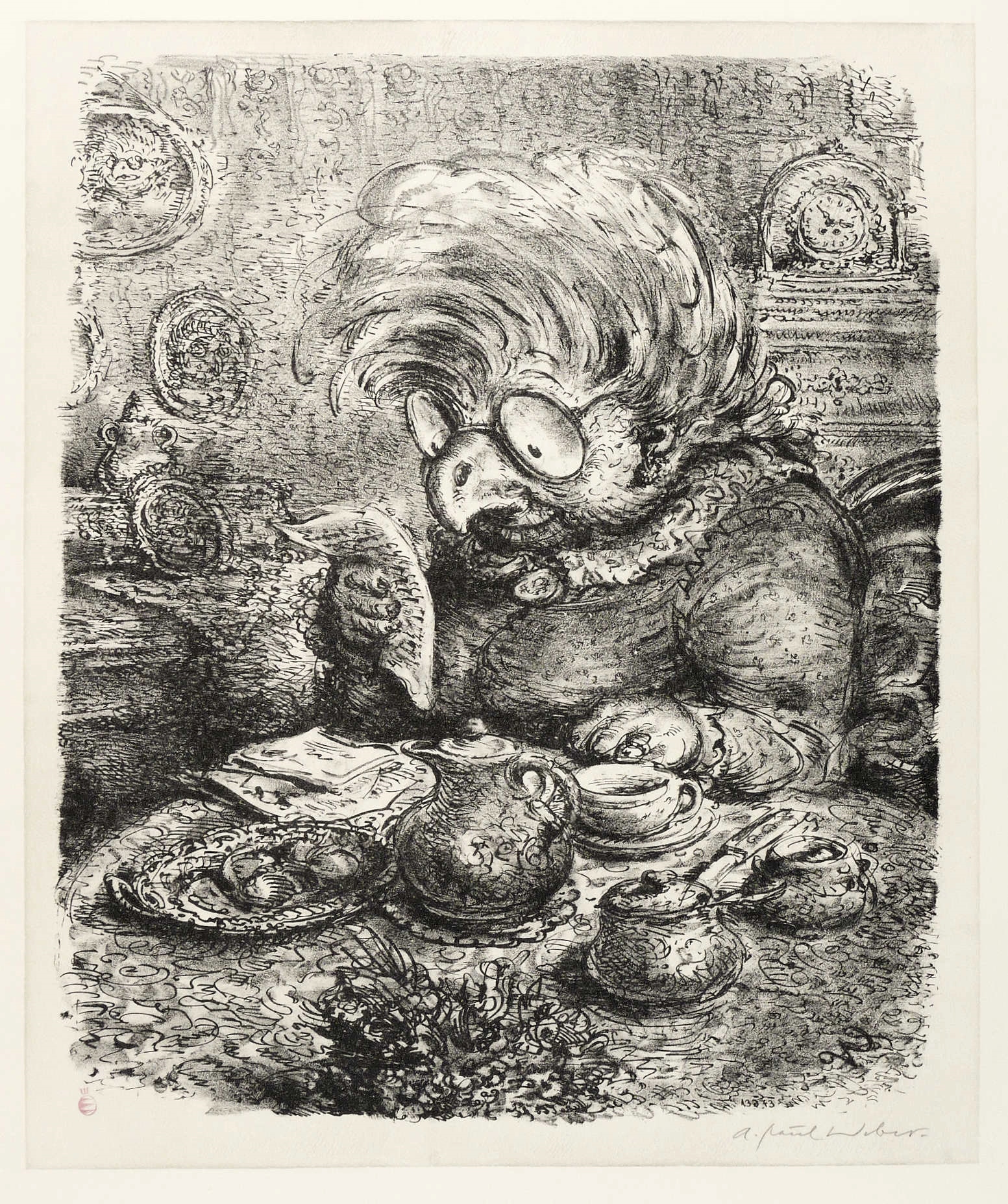 1973. Lithografie / Feder- & Kreidelithografie, in Schwarz, über Tonplatte, auf weißem Büttenkarton. – Von Andreas Paul Weber. – 39,6 x 32,5 cm (Darstellung), 42,3 x 35,3 cm (Tonplatte), 65 x 53,5 cm (Blatt).