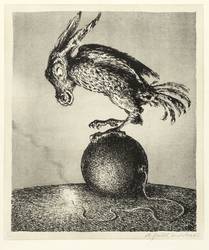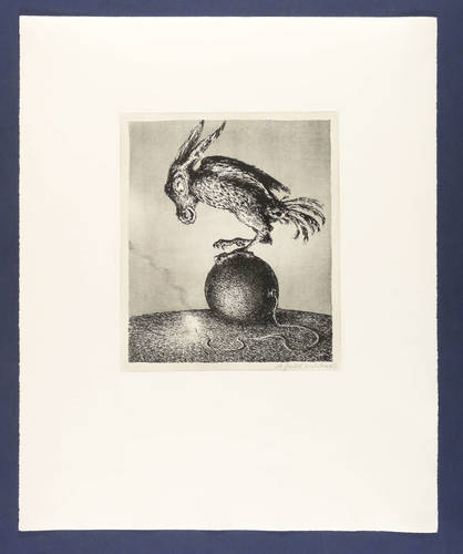 1977. Lithografie / Kreide- & Federlithografie, in Schwarz, über Tonplatte, auf hellgelbem Büttenkarton. – Von Andreas Paul Weber. – 31,0 x 26,0 cm (Darstellung), 33,0 x 28,1 cm (Tonplatte), 65 x 53 cm (Blatt).