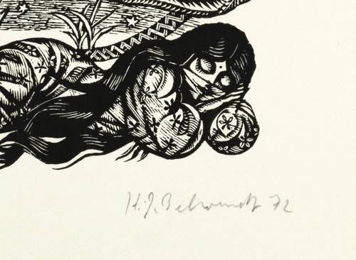 Hans-Joachim Behrendt (*1937 Magdeburg, lebt und arbeitet in Zingst). Deutscher Holzstecher und Illustrator. Ab 1954 Tätigkeit als Hilfsbeleuchter am Theater Magdeburg. 1955-60 Studium Grafik an der Kunsthochschule Berlin-Weißensee, u.a. bei Werner Klemke, Arno Mohr, Paul Rosié und Klaus Wittkugel. Danach freischaffend in Belrin tätig. Seit 1995 in Zingst ansässig. V.a. Illustrationen für Kinderbücher, daneben Gelegenheitsgrafik und Exlibris.