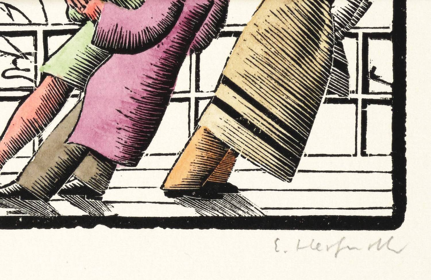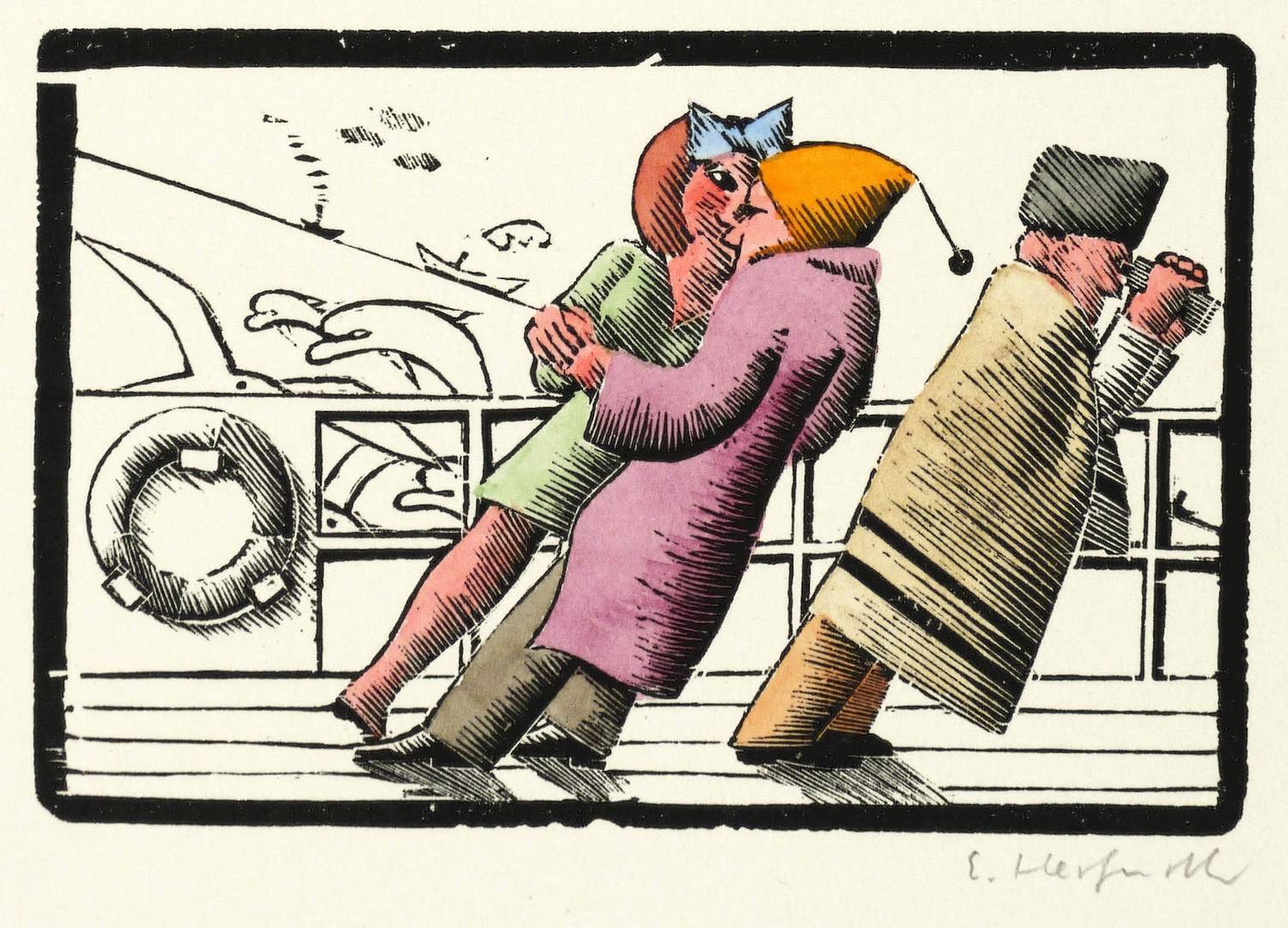 1969. Holzschnitt, in Schwarz, aquarelliert, auf glattem hellem Karton. – Originale Künstlergrafik, von Egbert Herfurth. – 5,7 x 8,5 cm (Darstellung), 30 x 21 cm (Blatt).