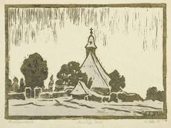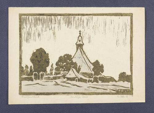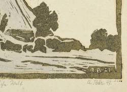 1947. Linolschnitt, in Grau, aquarelliert, auf gelblichem Maschinenpapier. – Originale Künstlergrafik, von Artur Bär. – 12,4 x 17,1 cm (Darstellung / Druckstock), 14,5 x 20,5 cm (Blatt).