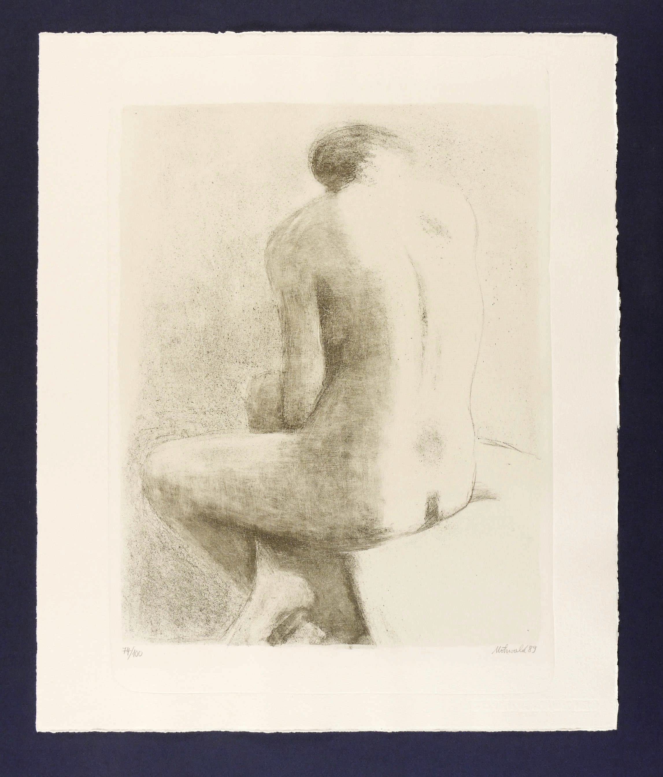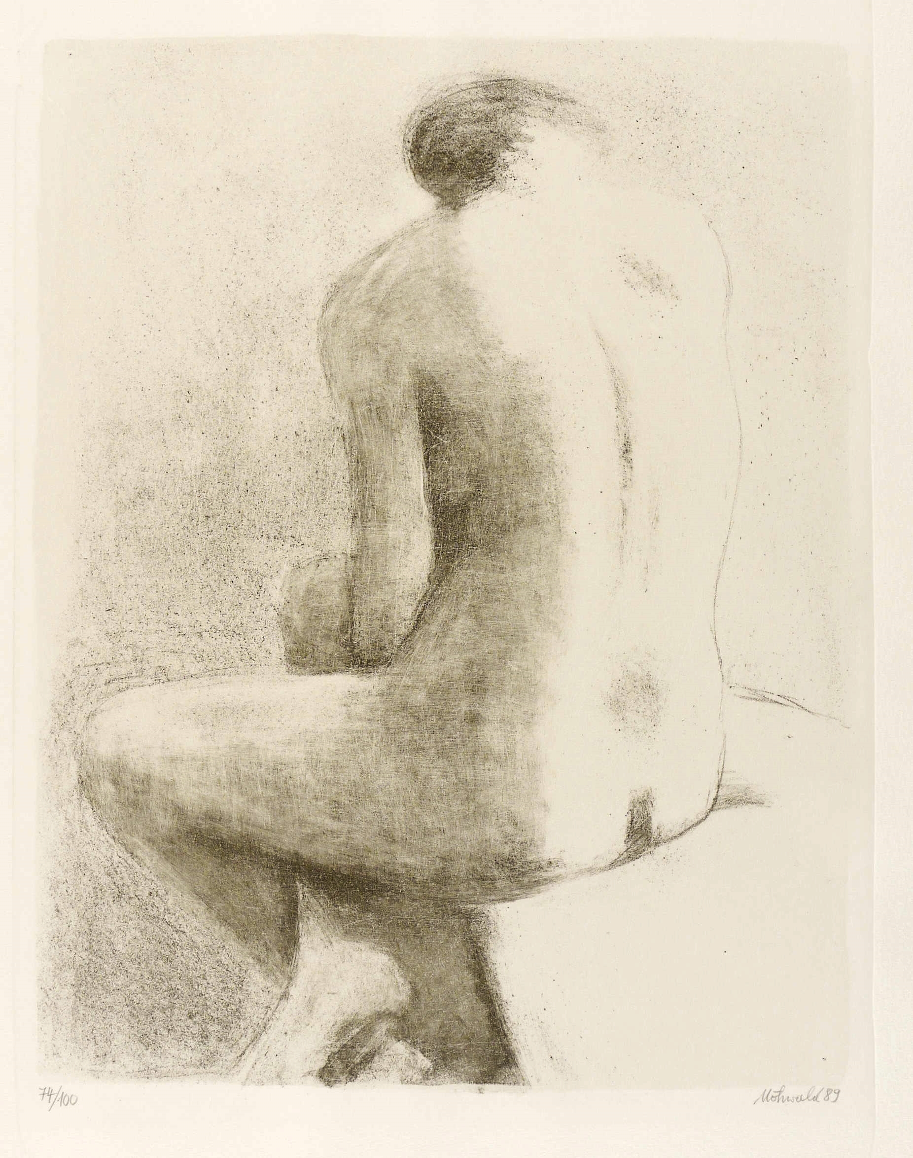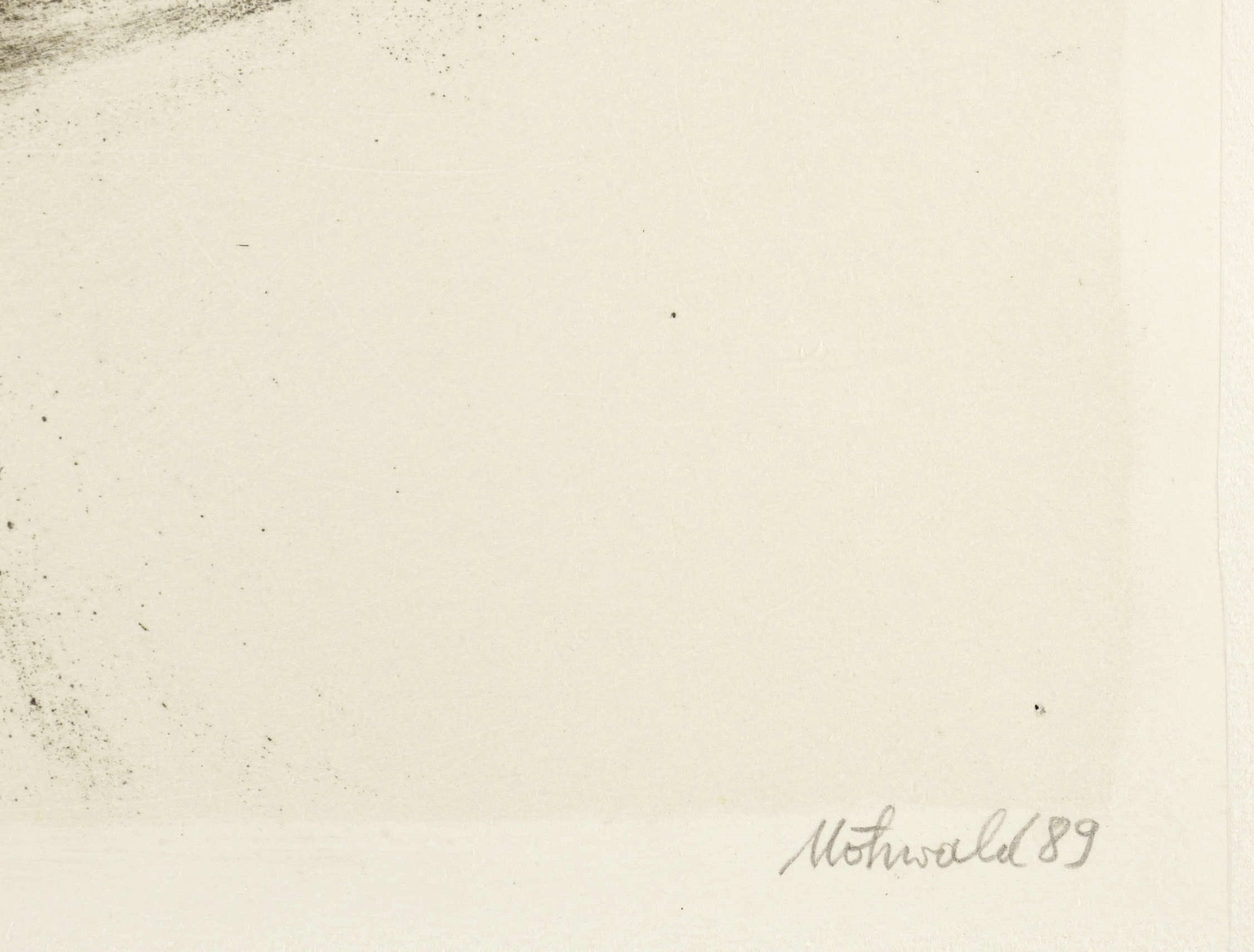 1989. Farblithografie / Kreide- & Pinsellithografie, in Hellbeige & Schwarz, auf Hahnemühle-Bütten. – Von Otto Möhwald. – Auflage Exemplar Nr. 74/100. – 45,8 x 35,7 cm (Darstellung), 59 x 49 cm (Blatt).