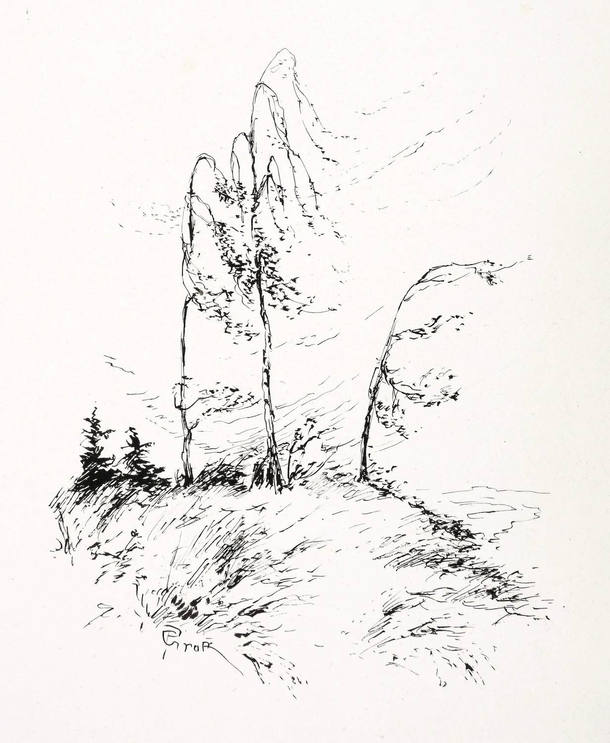 In der Darstellung links unten in Feder und Tusche signiert: ″PGroß″. – Aus einem teilweise datierten Zeichnungs- Konvolut, dass 1920 in verschiedenen Badeorten entlang der Ostseeküste entstand. – Unbeschnittenes Exemplar. Papier mit unscheinbaren Altersspuren. Verso am oberen Rand ältere Montagereste. Insgesamt sehr guter Zustand.