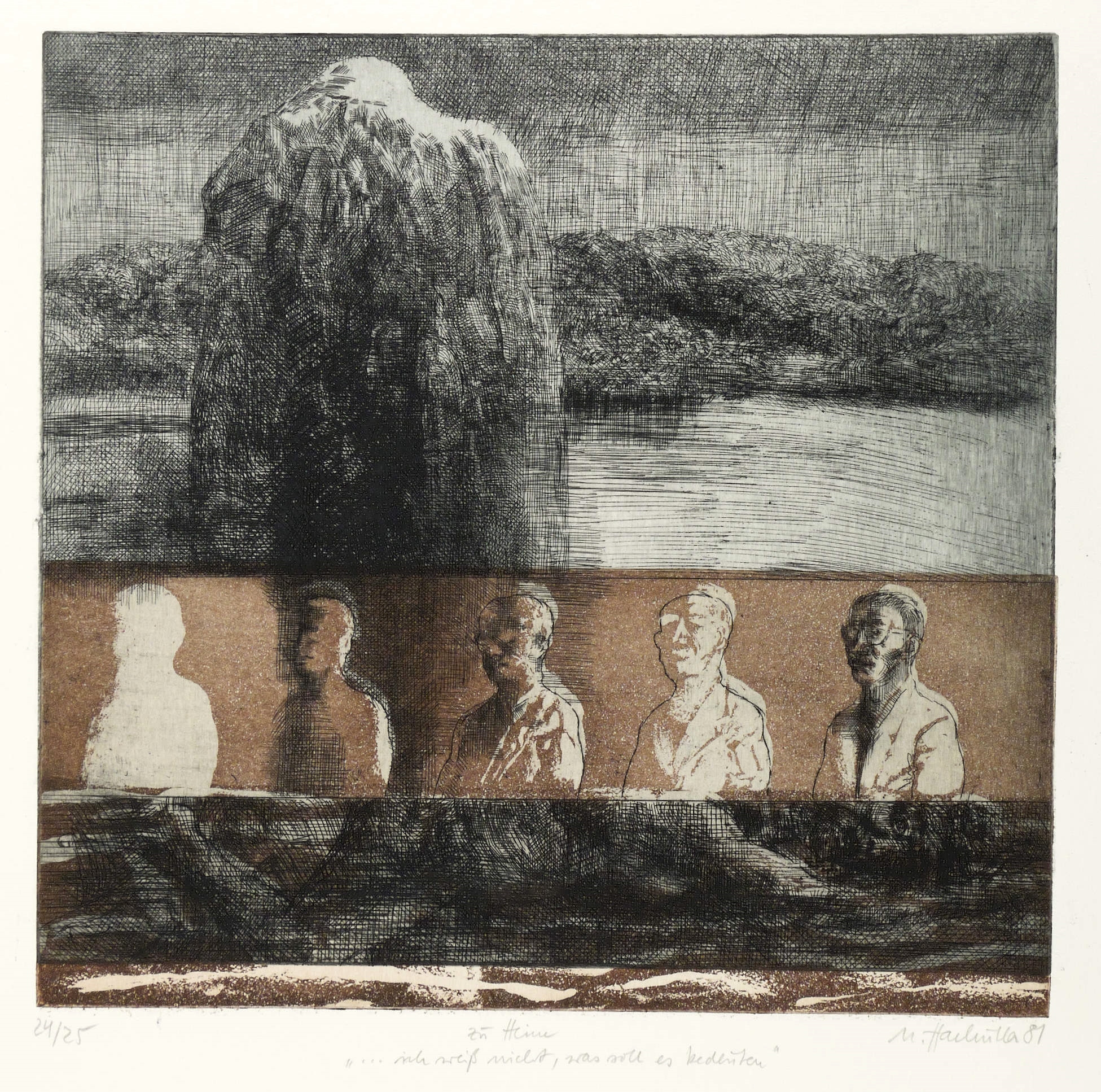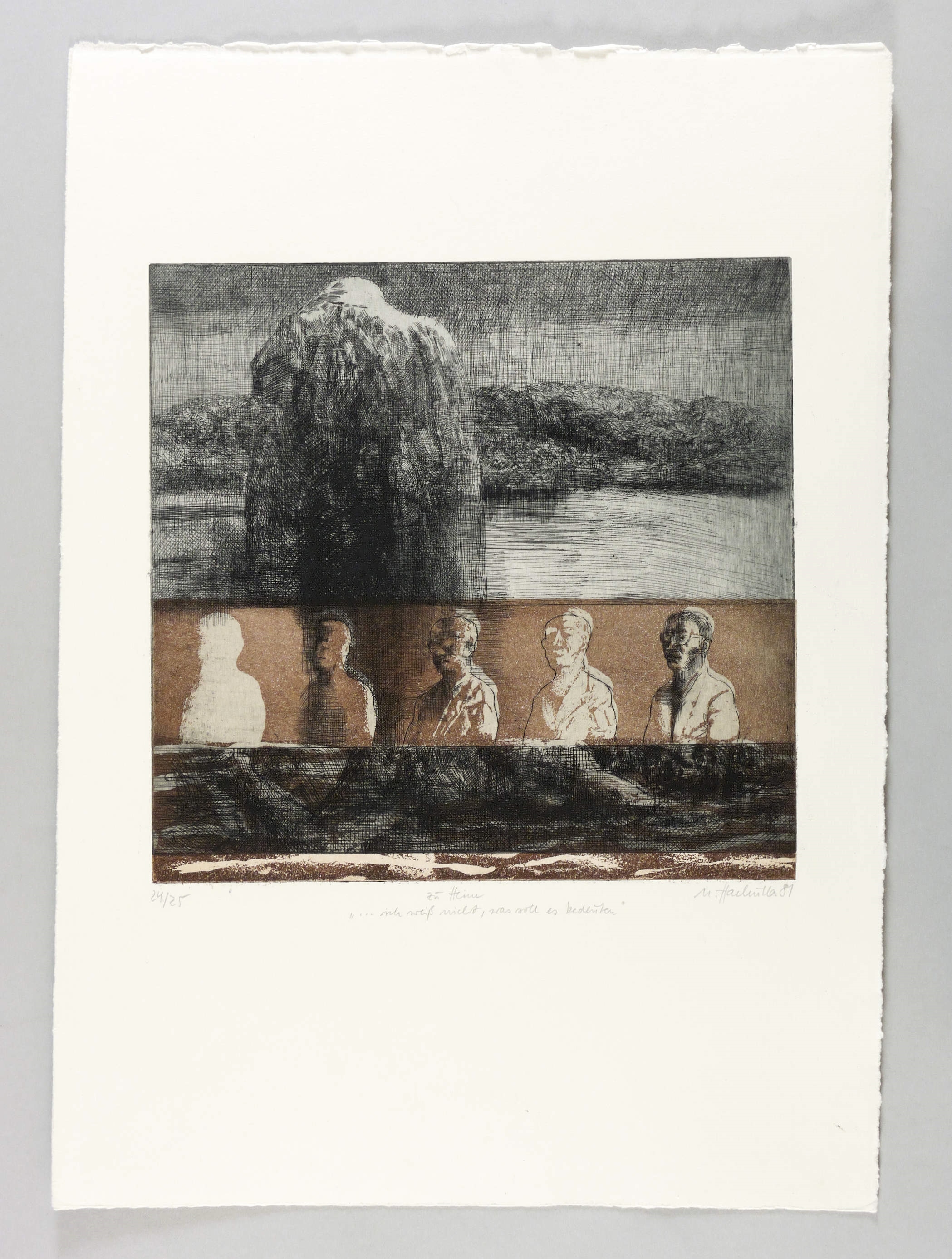 1981. Farbradierung / Aquatinta & Strichätzung, in Blauschwarz & Braun, auf schwerem chamois Bütten. – Von Ulrich Hachulla. – Auflage Exemplar Nr. 24/25. – 25,8 x 26,8 cm (Darstellung / Platte), 48 x 35 cm (Blatt).