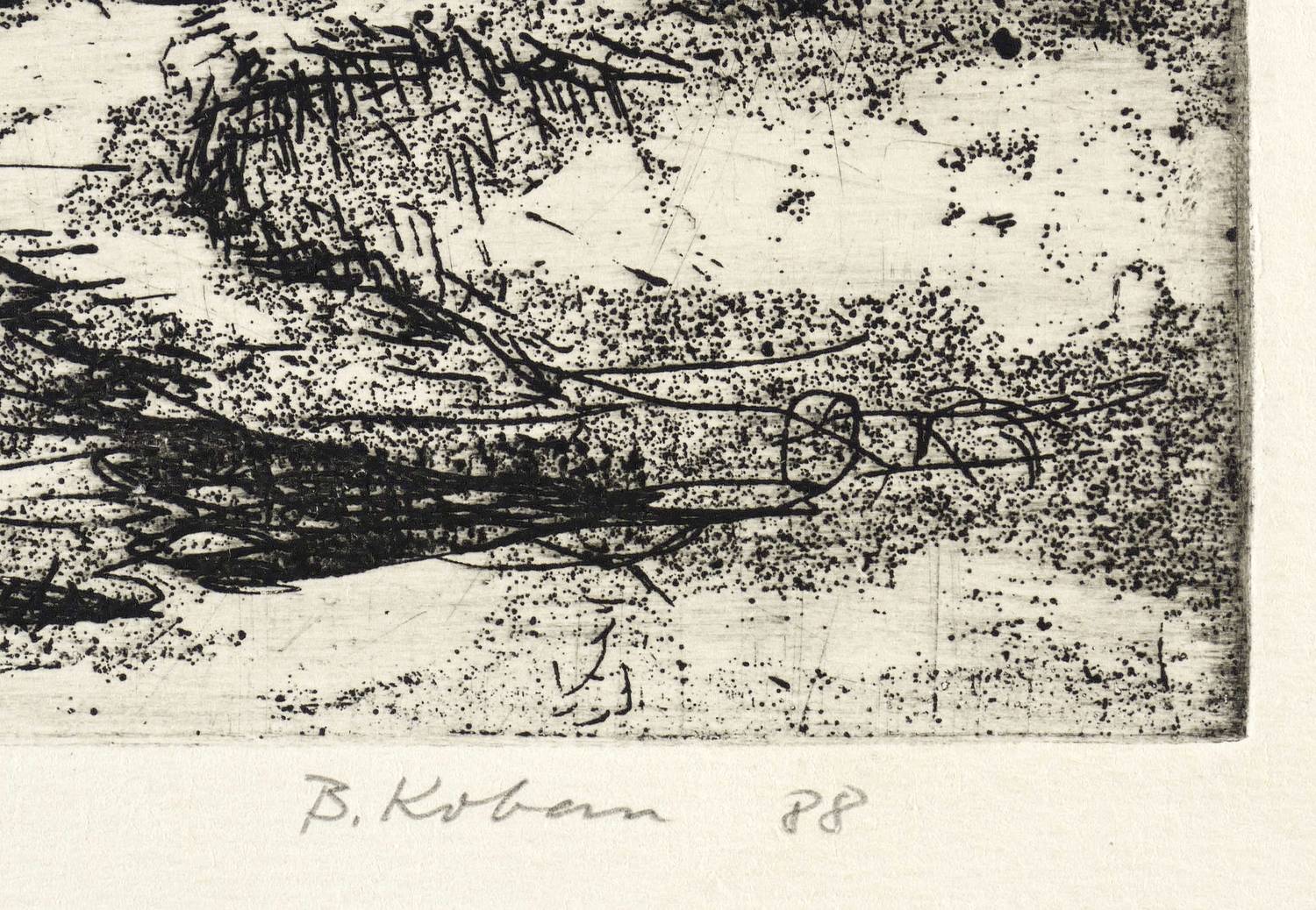 1988. Radierung / Vernis mou & Strichätzung, in Schwarz, auf Büttenkarton. – Originale Künstlergrafik, von Bernhard Koban. – Künstlerexemplar (e.a.). – 19,8 x 29,4 cm (Darstellung / Platte), 23,5 x 32,5 cm (Blatt).