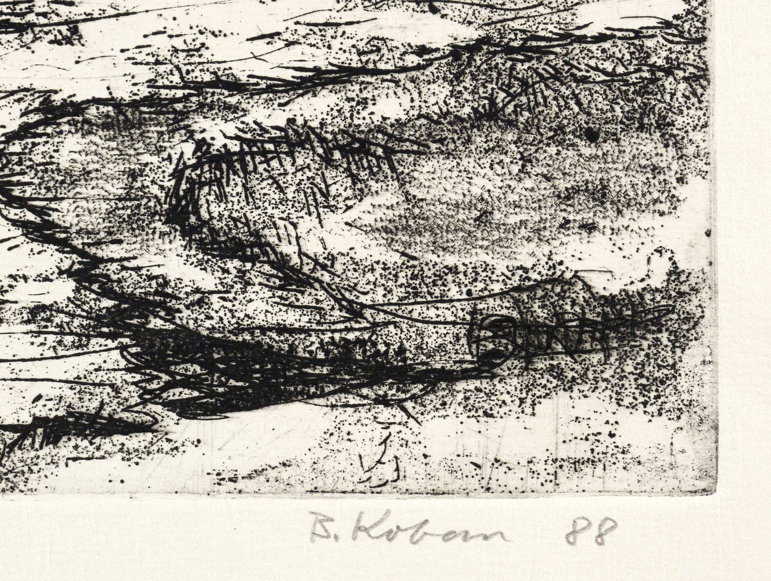 1988. Radierung / Vernis mou & Strichätzung, in Schwarz, auf Büttenkarton. – Originale Künstlergrafik, von Bernhard Koban. – Künstlerexemplar (e.a.). – 19,8 x 29,4 cm (Darstellung / Platte), 24 x 33 cm (Blatt).