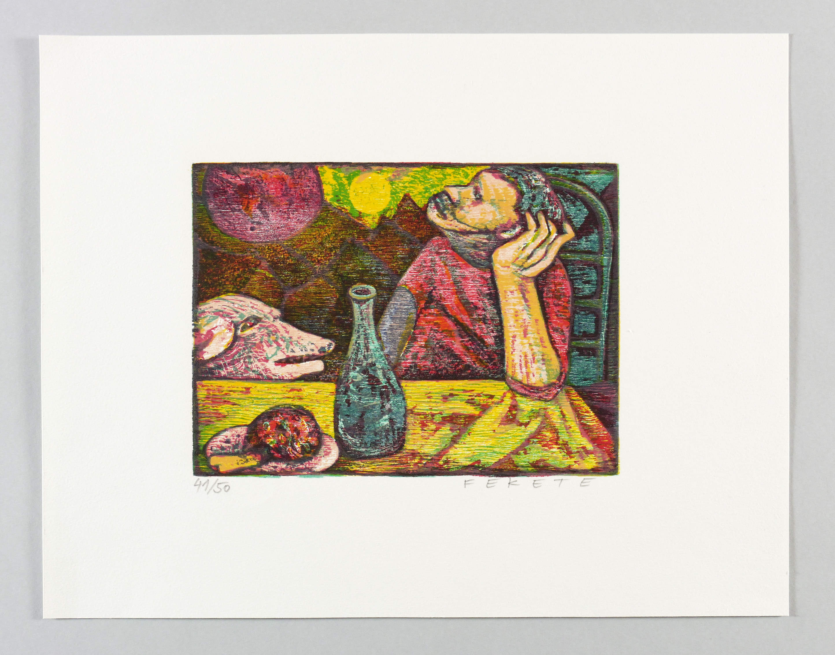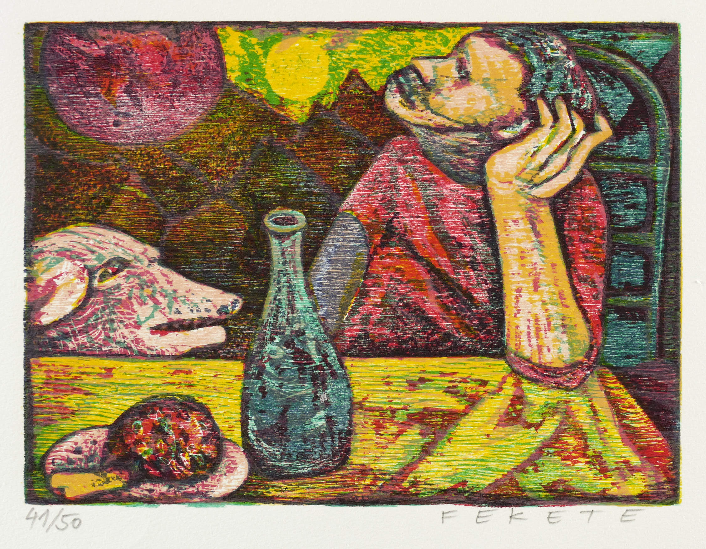 Esteban Fekete (1924 Cinkota / Budapest - 2009 Dieburg). Deutsch-argentinischer Maler, Zeichner und Grafiker. Arbeitete in verschiedenen Techniken wie Öl und Tempera, aber auch in Mischtechniken auf Papier, Holz oder Hartfaser. Anfang der 1970er Jahre entstanden Email-Bilder, Zeichnungen und Linolschnitt. Seine ureigene Technik ist allerdings der Holzschnitt, insbesondere der Farbholzschnitt, mit dem er sich einen Namen machte. So entwickelte er eine eigene Schnitt- und Bearbeitungstechnik für die Holzplatten. Für die Farbgebung verwendete er eigens dafür gesuchte Ölfarben.