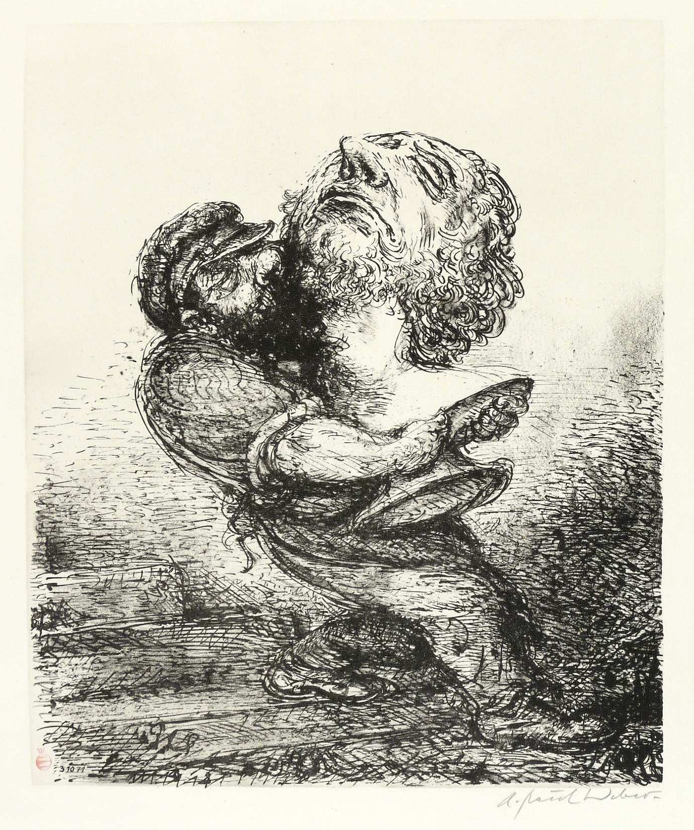 1971. Lithografie / Kreide- & Federlithografie, in Schwarz, über Tonplatte, auf Velinkarton. – Von Andreas Paul Weber. – 29,2 x 28,0 cm (Darstellung), 34,2 x 28,3 cm (Tonplatte), 66 x 54 cm (Blatt).