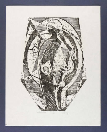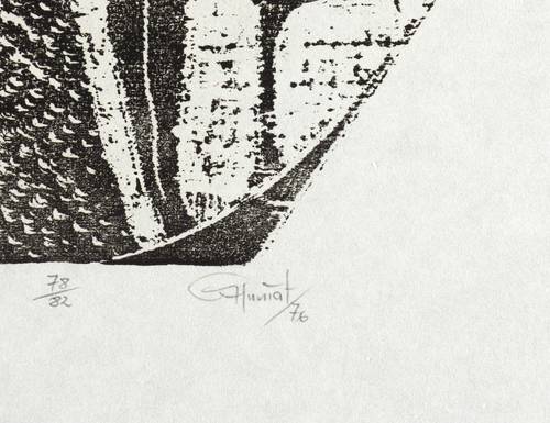 1976. Holzschnitt, in Schwarz, auf rauem weißem Maschinenpapier. – Originale Künstlergrafik, von Günther Huniat. – Auflage Exemplar Nr. 78/82. – 38,2 x 27,0 cm (Darstellung / Druckstock), 49 x 39 cm (Blatt).