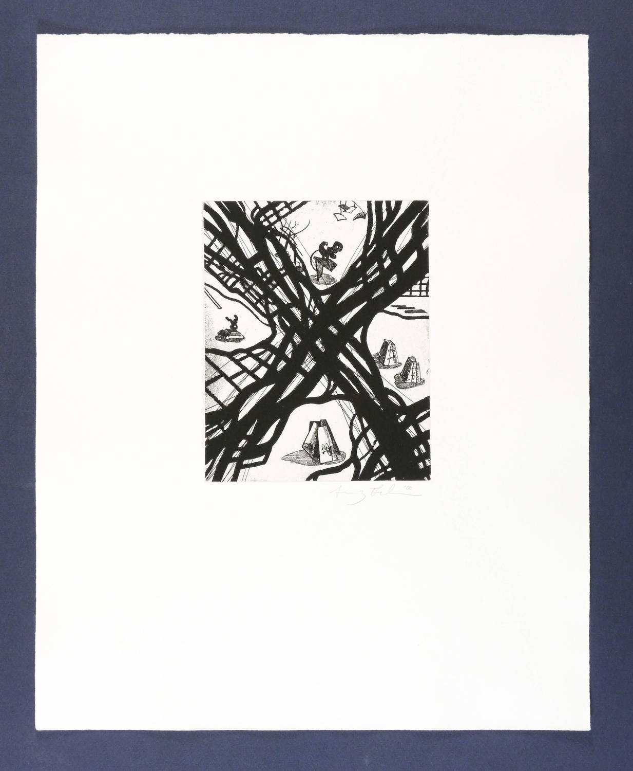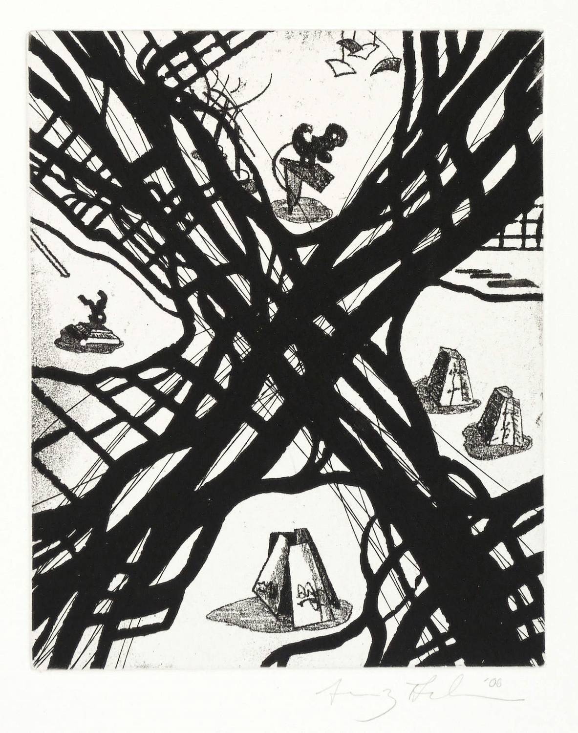2000. Radierung / Vernis mou, Aquatinta & Strichätzung, in Schwarz, auf weißem Zerkall-Bütten. – Originale Künstlergrafik, von Franz Ackermann. – 18,2 x 14,6 cm (Darstellung / Platte), 45 x 36 cm (Blatt).