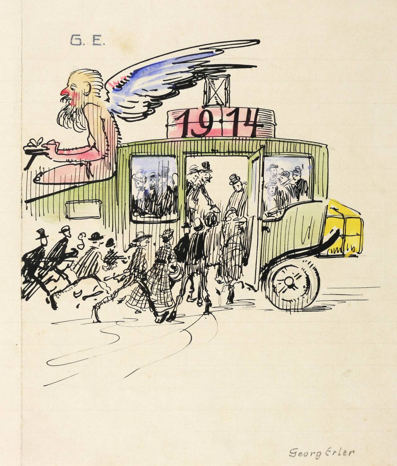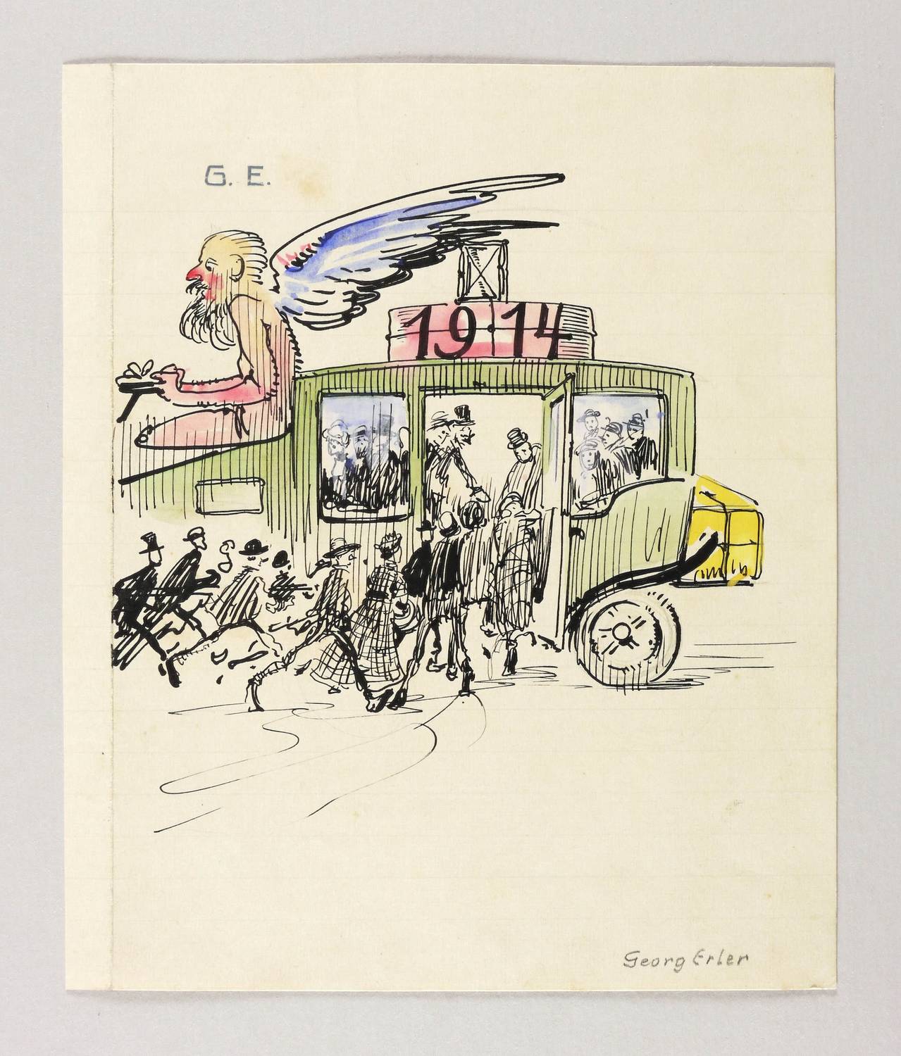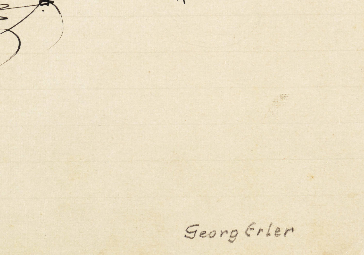 Links oben in schwarzer Feder signiert: ″G.E.″ Rechts unten in Bleistift von fremder Hand bezeichnet: ″Georg Erler″. – Entwurf für eine Neujahrskarte für das Jahr 1914. – Links an der Kante der Darstellung Bindefalte (wohl aus Skizzenbuch). Partiell unscheinbar fleckig. Insgesamt guter Zustand.