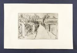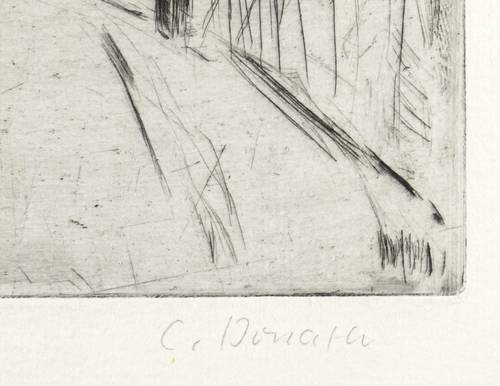 Um 1980. Radierung / Kaltnadel, mit Plattenton, in Schwarz, auf hartem Maschinenbütten. – Originale Künstlergrafik, von Christine Donath. – 14,6 x 21,8 cm (Darstellung / Platte), 25 x 37,5 cm (Blatt).