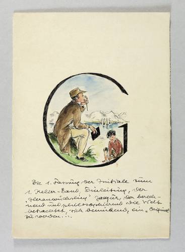Unterhalb in schwarzer Feder Kommentar. Verso erster Teil eines Kartengrusses der Künstlerin an Franz Schwimmer, gen. Siska. – Entwurfszeichnung für die Initiale G zu Gottfried Keller ″Was der Herr Pate aus dem alten Zürich erzählte. Der Züricher Novellen Erster Teil″, das 1943 mit Buchillustrationen der Künstlerin im Leipziger Verlag Buch und Volk erschien. - Aus dem Nachlass des Malers Franz Schwimmer, gen. Siska, Privatbesitz Leipzig. – Tadellos erhalten. Sehr guter Zustand.