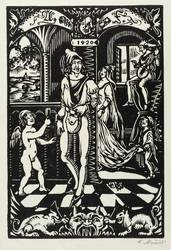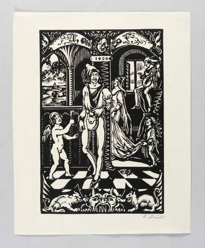 Karel Němec (1879 Neustadt in Mähren / Nové Město - 1960 Nové Město). Tschechischer Wandmaler, Grafiker, Illustrator und Exlibris-Künstler. Absolvierte die private Malschule von Alois Kalvoda in Prag. Anschließend abgebrochenes Studium an der Kunstgewerbeschule in Prag. Täigkeit im Geschäft des Vaters in Vysočina, nebenbei Malerei und Zeichnung. Im 1. Weltkrieg als Soldat an der russischen Front, Kriegsgefangenschaft in der Ukraine. Danach Zeichenlehrer an der Fabrikindustrieschule. Daneben Linolschnitte, Illustrationen, Buchumschläge und Porträts. 1919 Rückkehr nach Nové Město, wo er als freier Grafiker tätig war. Ein bedeutender Teil seines Schaffens war der Wanddekoration bzw. Wandmalerei in einer dem Sgraffito ähnlichen Technik vornehmlich in Weiß, Ziegelrot und Braun vorbehalten.