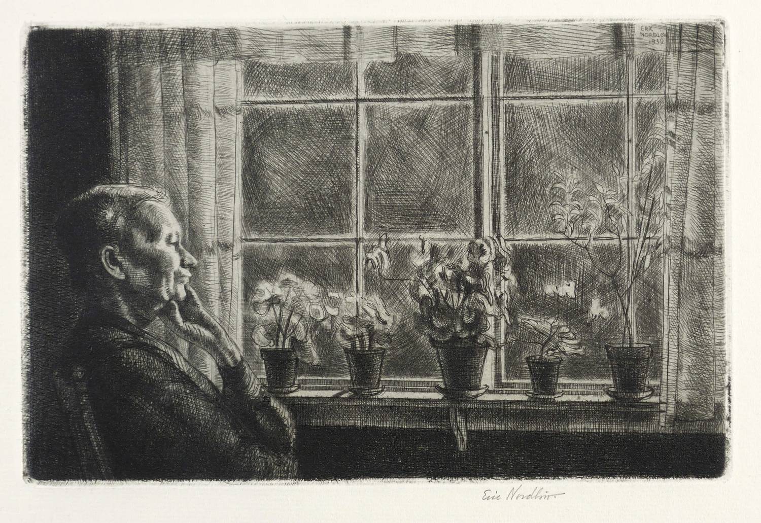1939. Radierung / Kaltnadel, in Schwarz, auf feinem gelbem Van-Gelder-Zonen-Bütten. – Originale Künstlergrafik, von Eric Nordlöw. – 11,7 x 17,9 cm (Darstellung / Platte), 23 x 30 cm (Blatt).