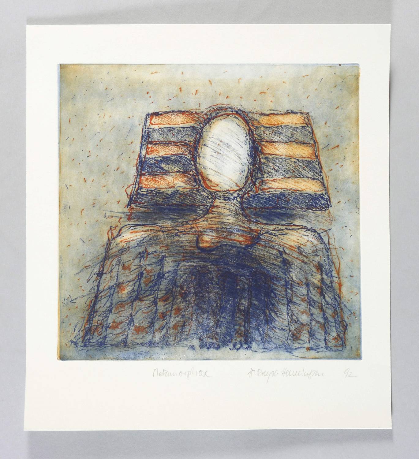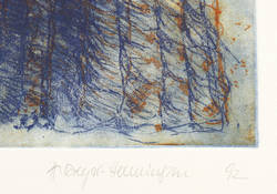1992. Farbradierung / Vernis mou & Roulette, inRot & Blau, auf hellem Velinkarton. – Von Hanna Dreyer-Henningsen. – 23,6 x 24,1 cm (Darstellung / Platte), 32 x 29 cm (Blatt).
