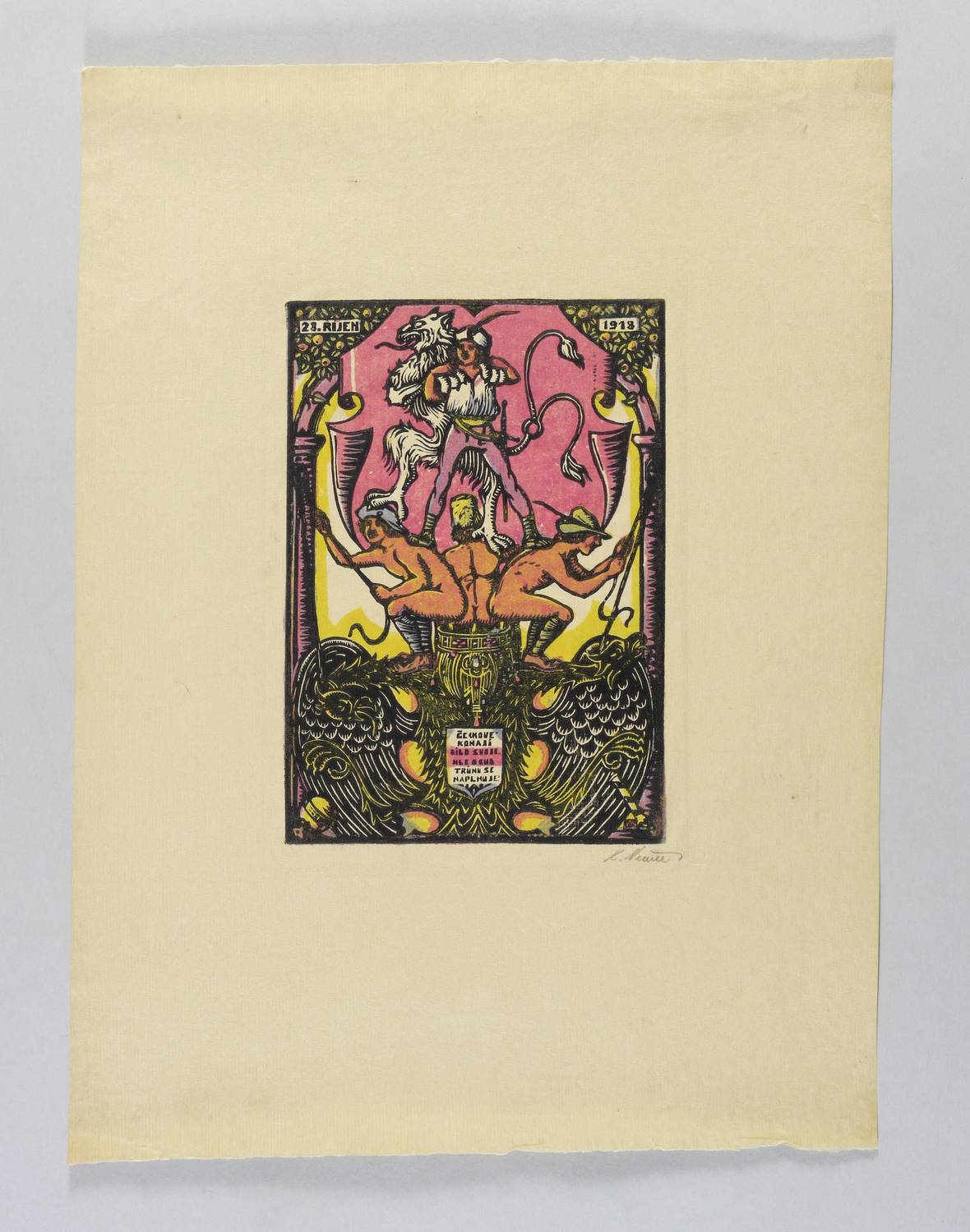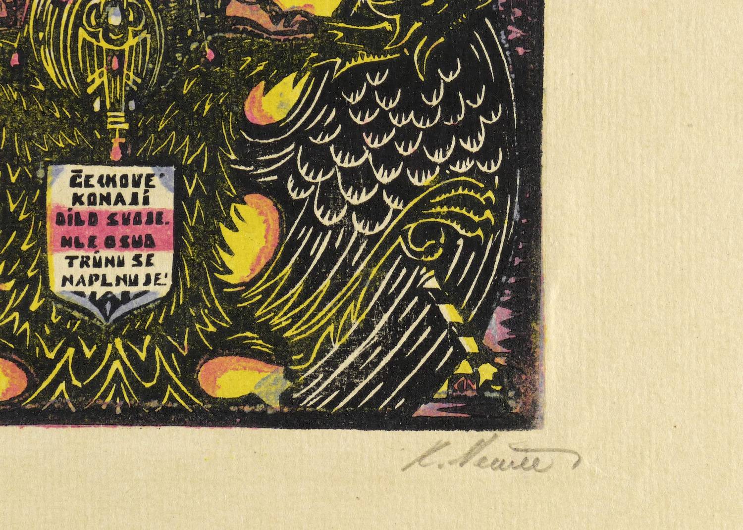 1918. Farbholzschnitt, in 5 Farben, auf feinem gelbem Büttenpapier. – Originale Künstlergrafik, von Karel Němec. – 20,6 x 14,4 cm (Darstellung / Druckstock), 42 x 31 cm (Blatt).