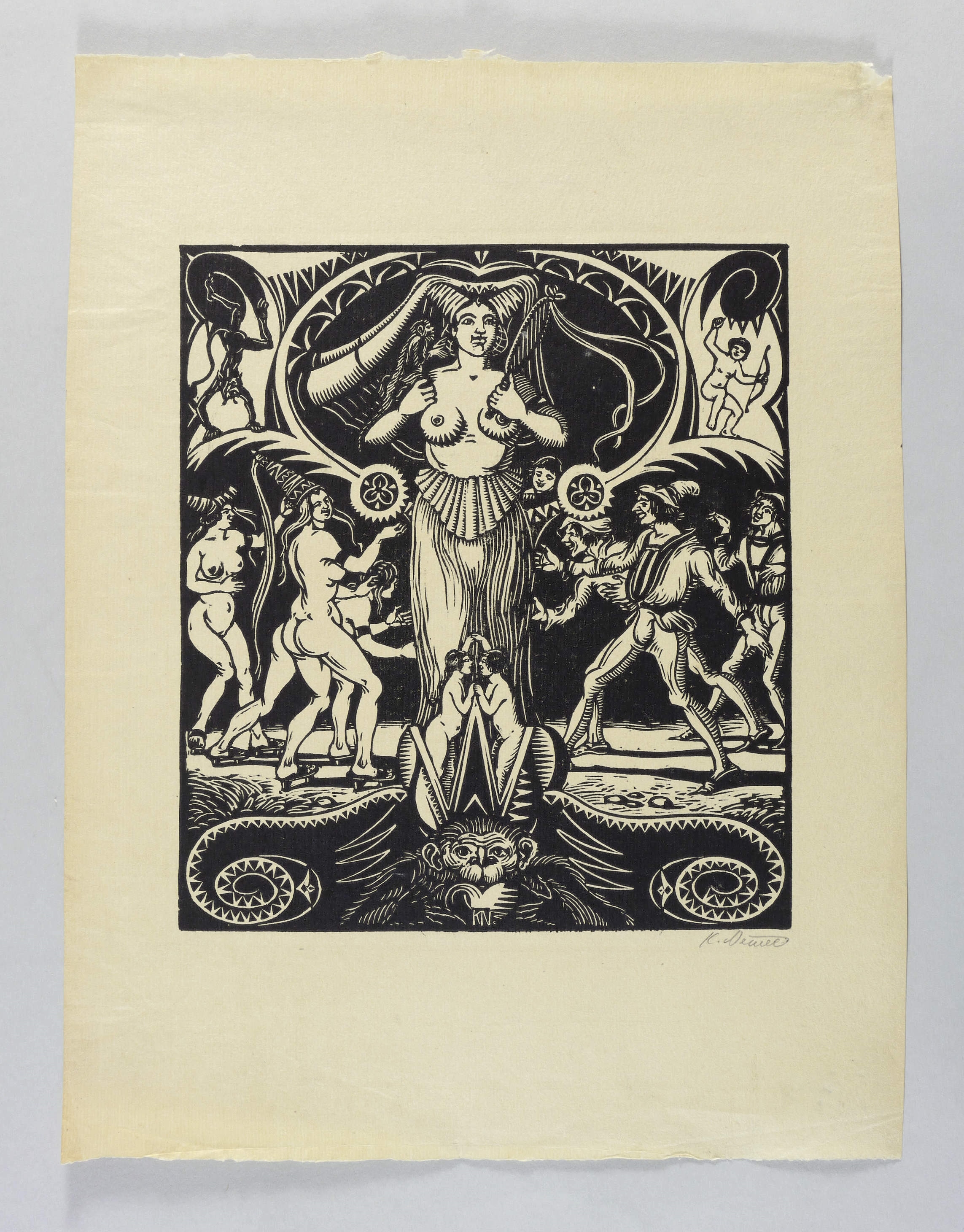 1915-1925. Holzschnitt, in Schwarz, auf feinem gelbem Büttenpapier. – Originale Künstlergrafik, von Karel Němec. – 25,8 x 22,8 cm (Darstellung / Druckstock), 42 x 32 cm (Blatt).
