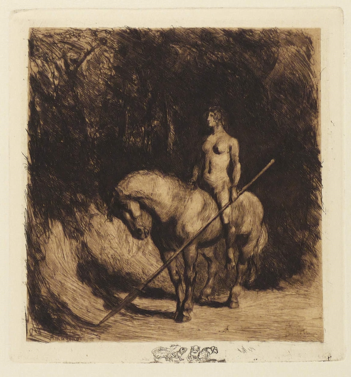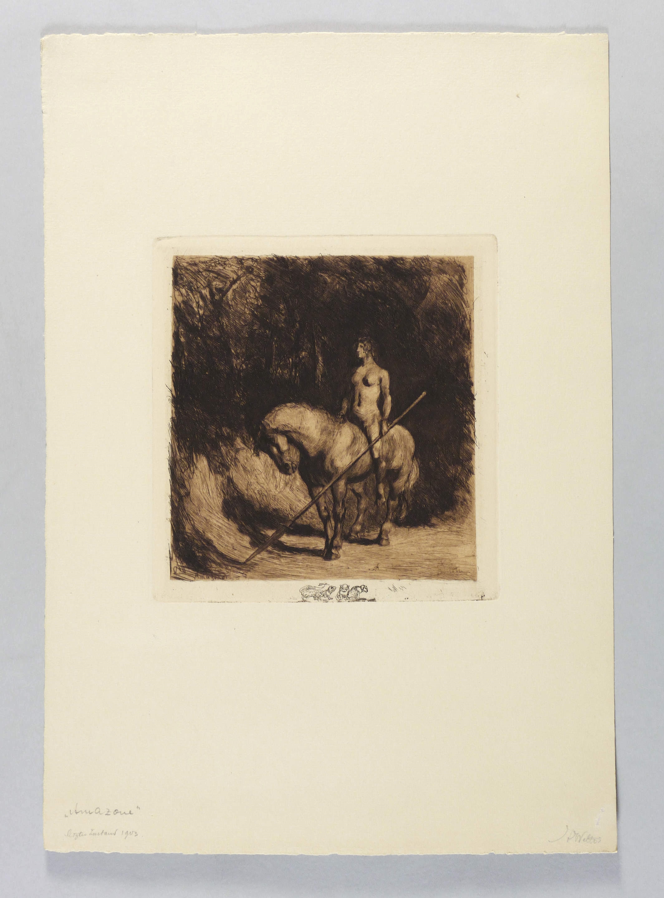 Rechts unten in Bleistift signiert: ″A Welti″. Links Titel, Zustandsbezeichnug und Jahr: ″Amazone / letzter Zustand 1903.″ In der Platte links unten nochmals Titel: ″Amazone″. – Im unteren Plattenrand Randzeichnung mit drei kleinen Drachenwesen. – Rückseitig in den Ecken Montagereste. Sonst tadellos. Sehr guter Zustand.