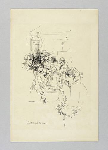 1975. Zeichnung / Federzeichnung, in schwarzer Tusche, auf hellgelbem Karton. – Originale Künstlergrafik, von Gitta Kettner. – Unikat. – 15,7 x 10,5 cm (Darstellung), 21 x 14 cm (Blatt).