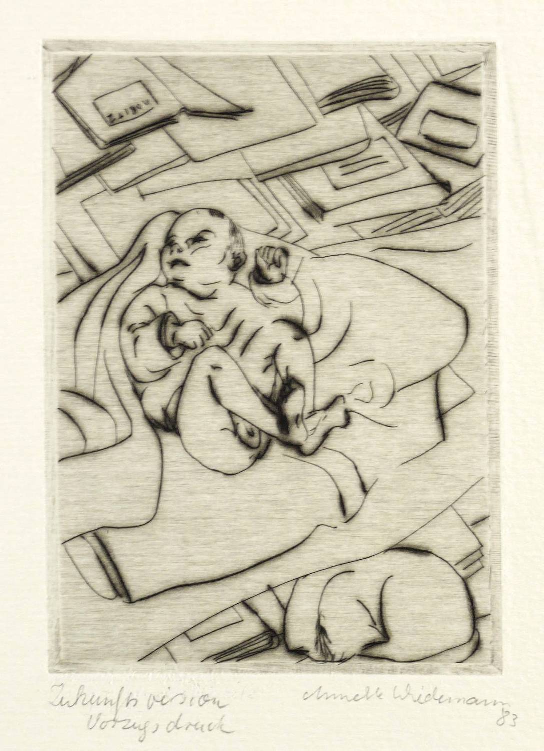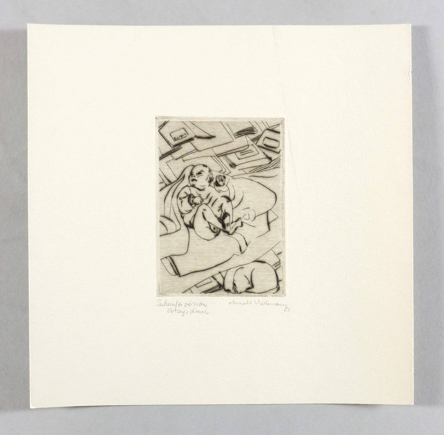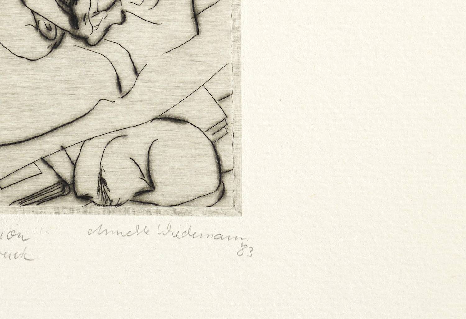 1983. Radierung / Kaltnadel, mit Plattenton, in Schwarz, auf Weißenborn-Bütten. – Originale Künstlergrafik, von Annette Wiedemann. – Vorzugsdruck. – 11,0 x 7,9 cm (Darstellung / Platte), 23 x 23 cm (Blatt).
