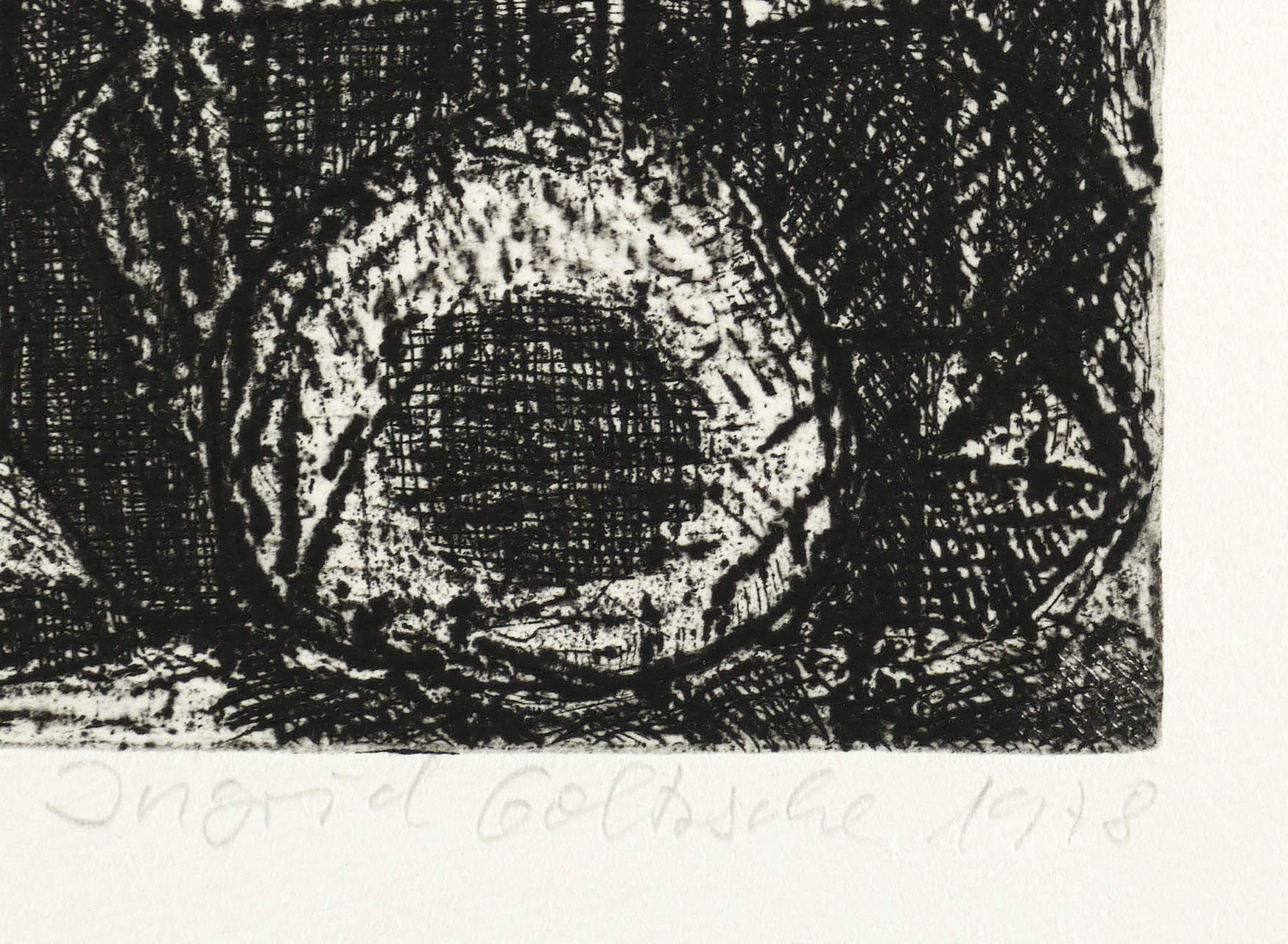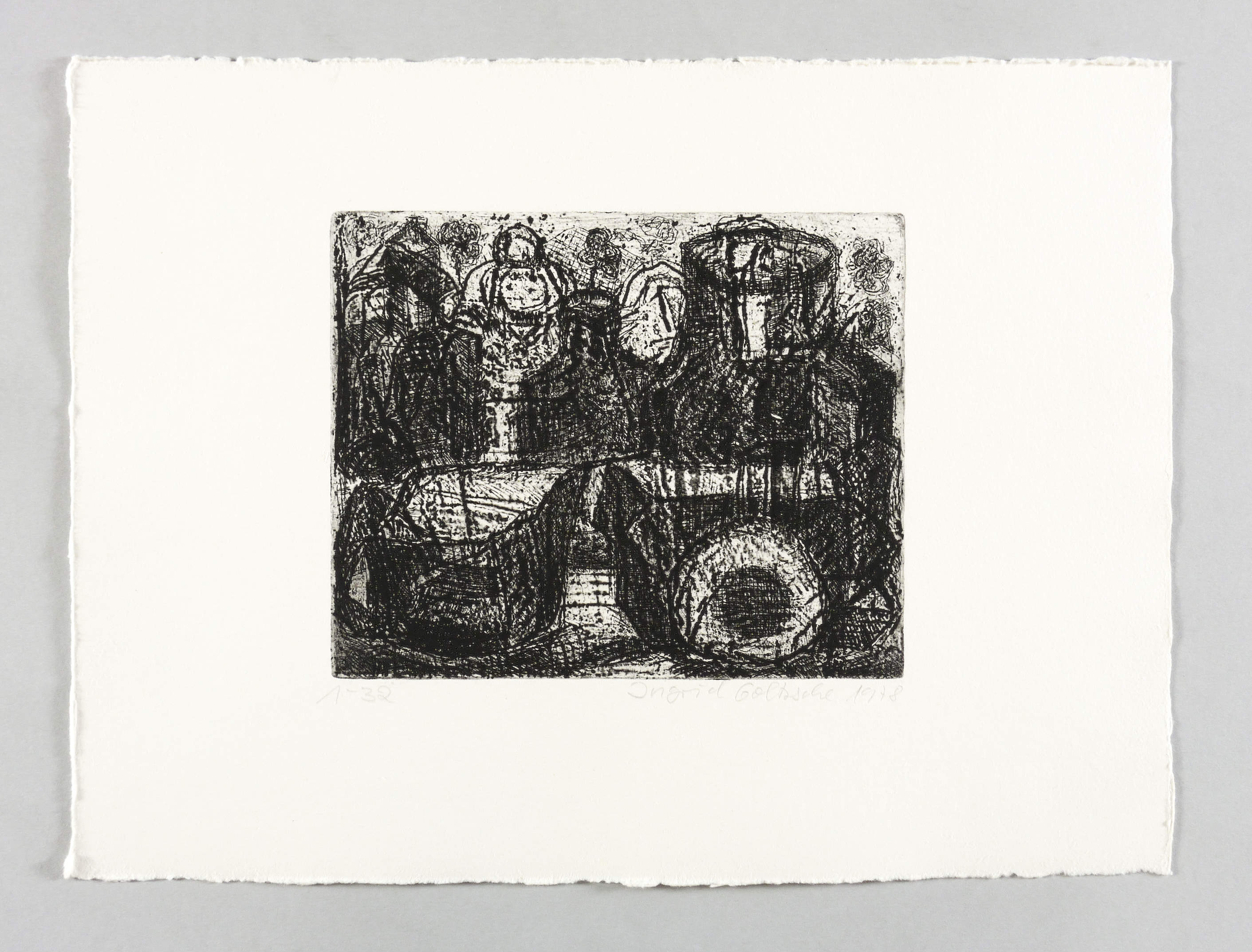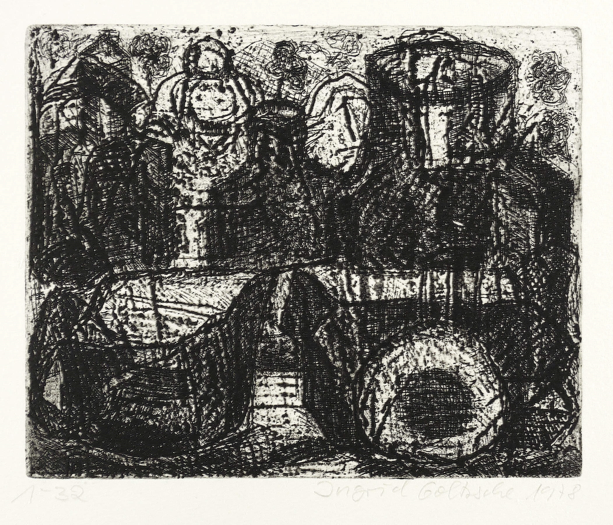 1978. Radierung / Reservage & Strichätzung, in Schwarz, auf schwerem hellchamois Hahnemühle-Bütten. – Originale Künstlergrafik, von Ingrid Goltzsche. – Auflage Exemplar Nr. 1/32. – 12,9 x 15,8 cm (Darstellung / Platte), 23 x 31 cm (Blatt).
