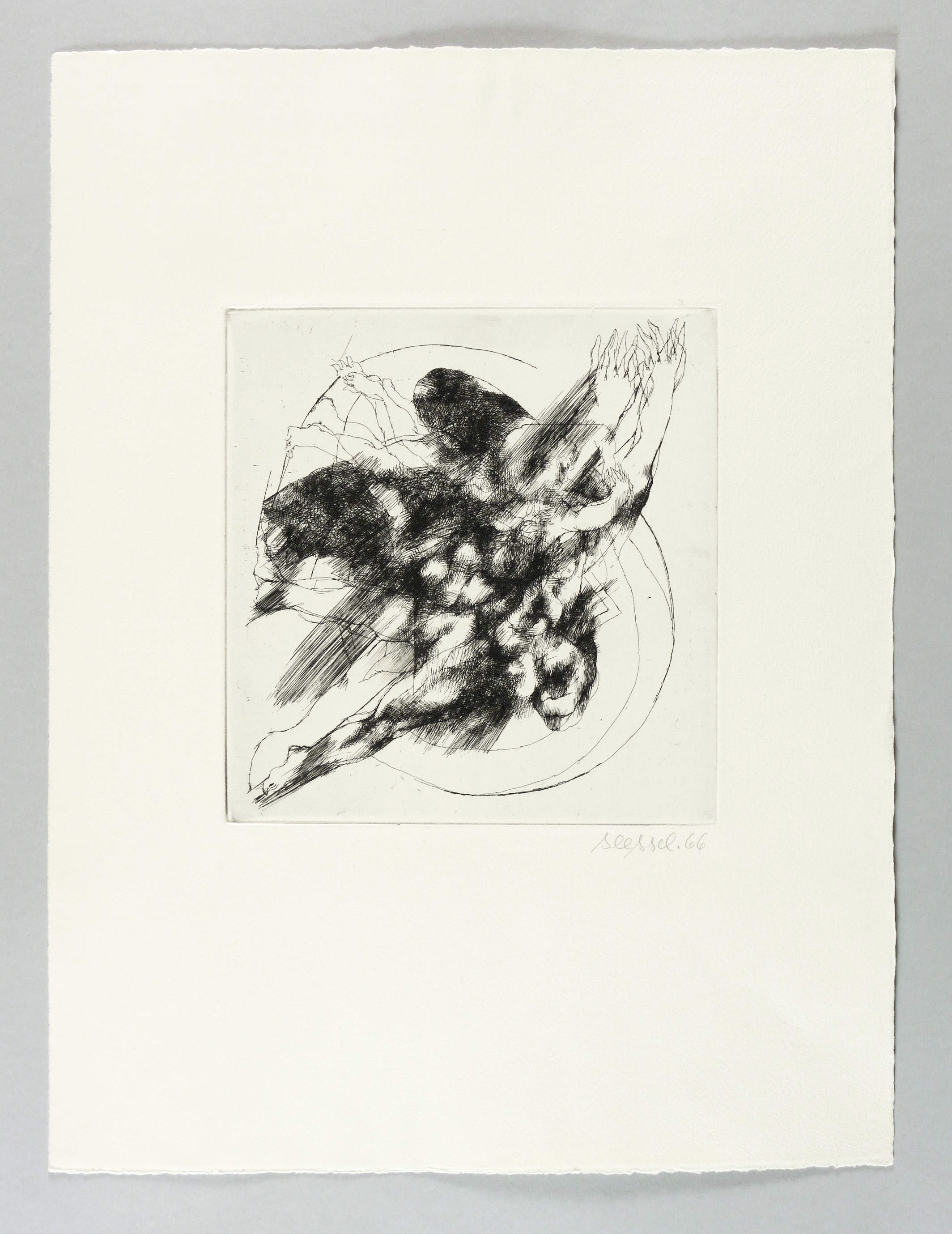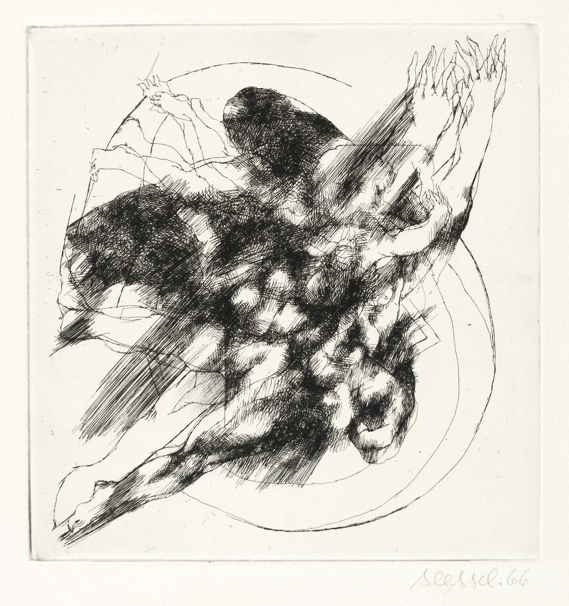 1966. Radierung / Strichätzung, in Schwarz, auf hellchamois Velinkarton. – Originale Künstlergrafik, von Wolf Seesselberg. – 20,7 x 19,7 cm (Darstellung / Platte), 45 x 34 cm (Blatt).