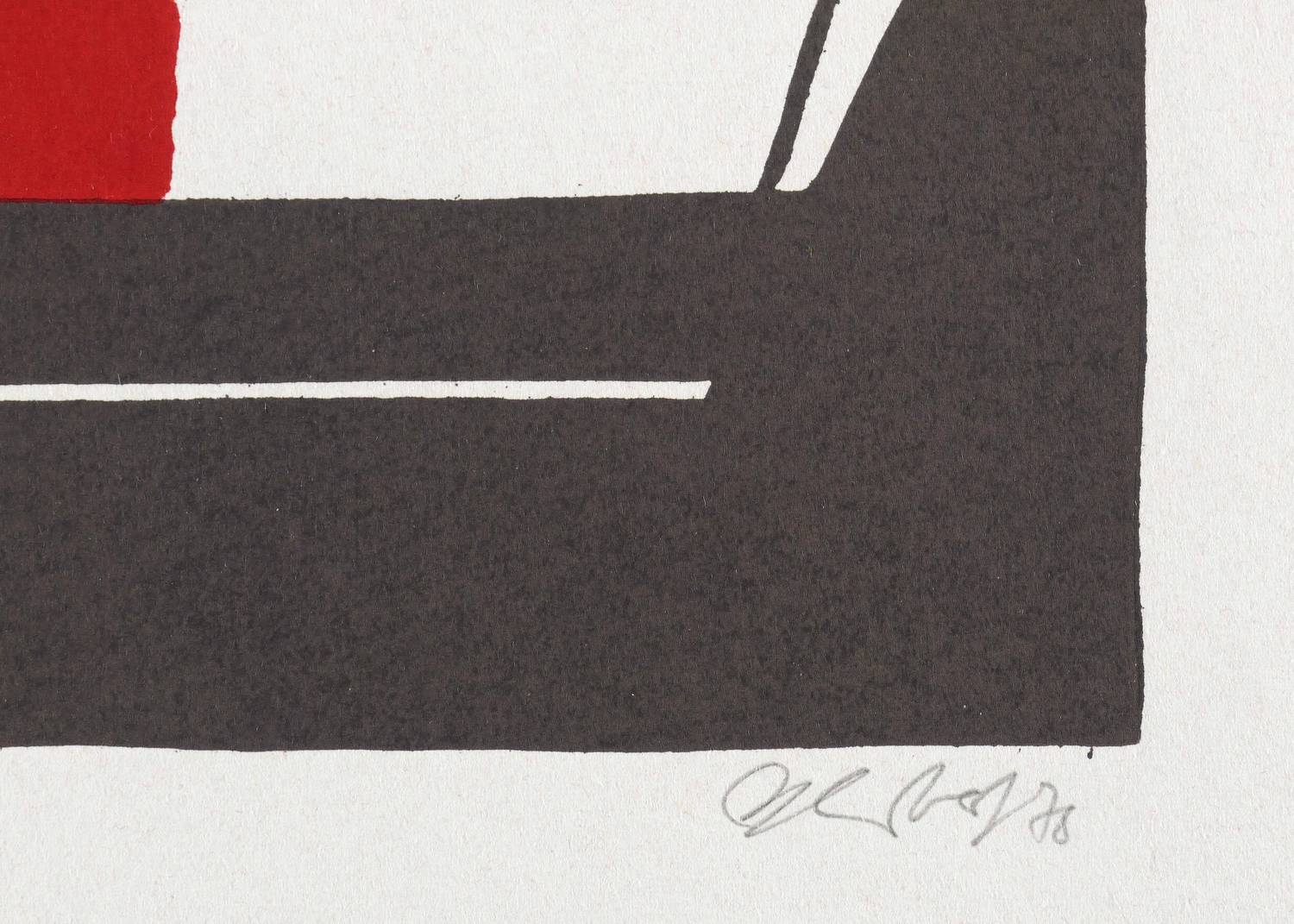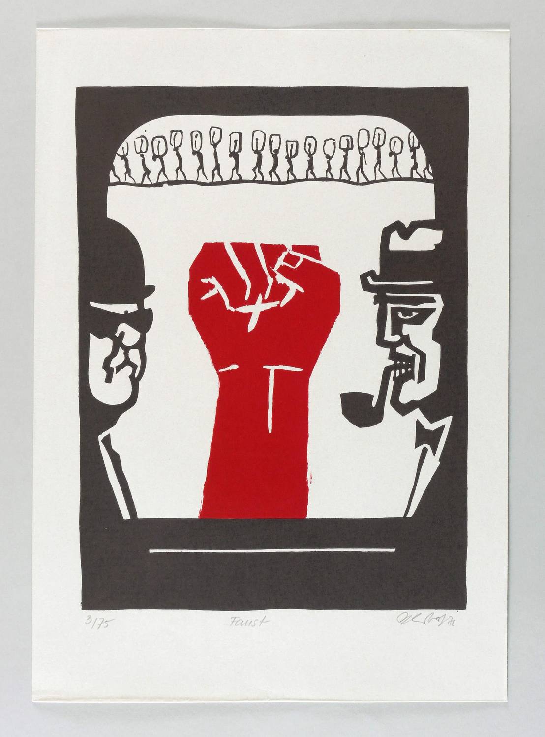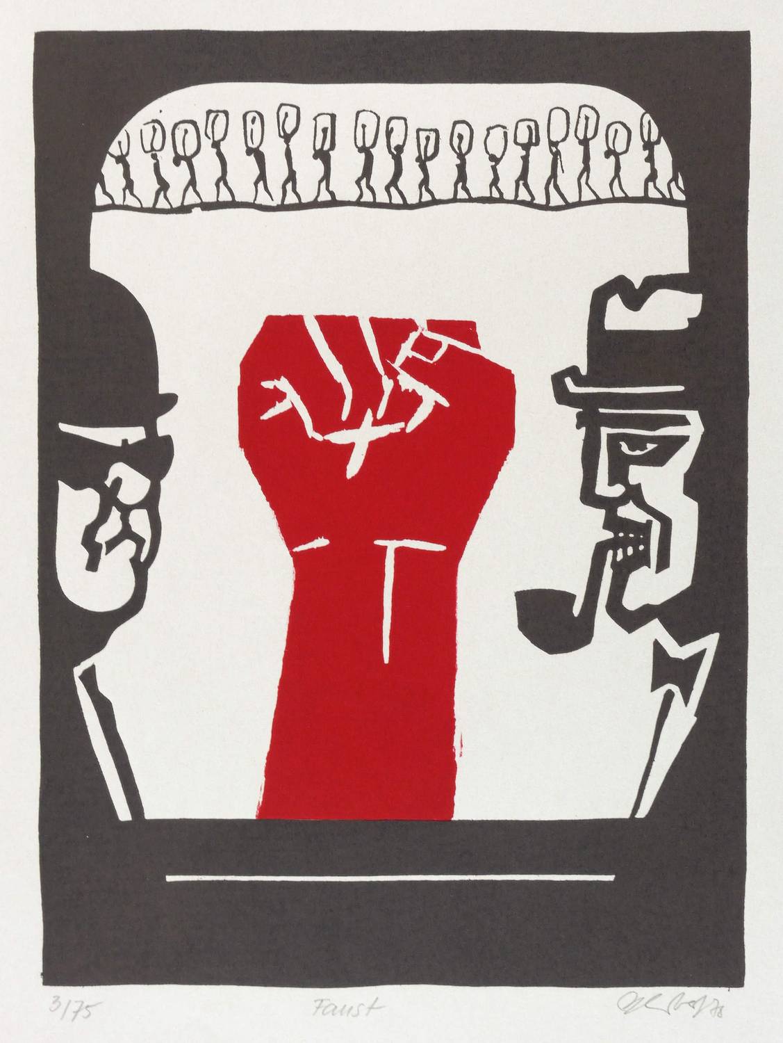 1978. Farbholzschnitt, in Rot & Schwarz, auf weißlich-hellgrauem Karton. – Originale Künstlergrafik, von Herbert Sandberg. – Auflage Exemplar Nr. 3/75. – 37,6 x 27,8 cm (Darstellung / Druckstock), 48 x 34 cm (Blatt).