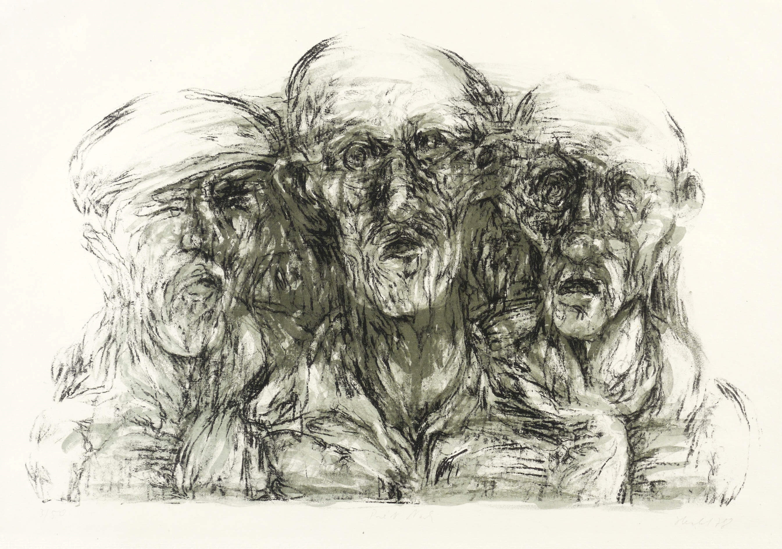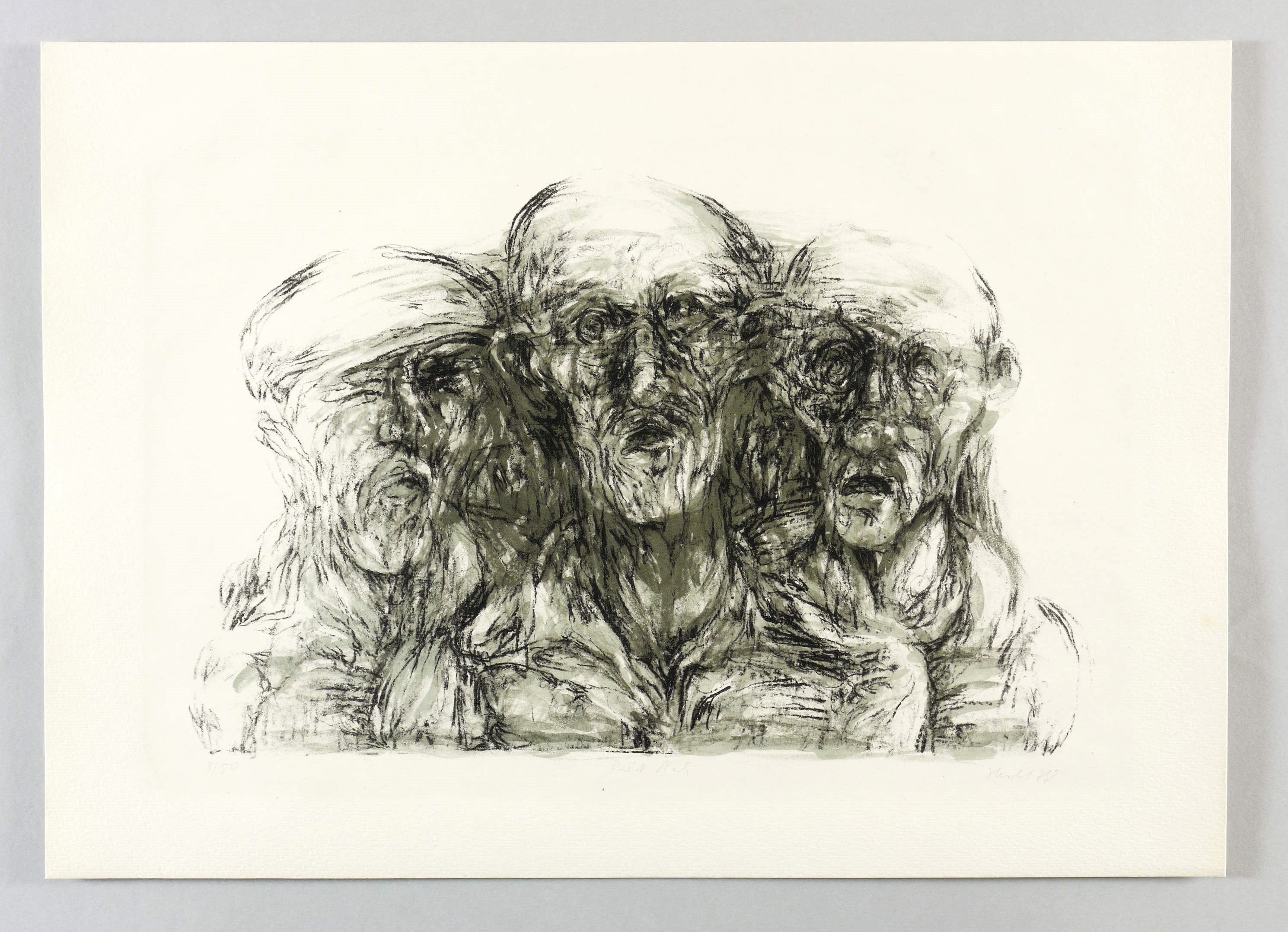 1978. Farblithografie / Kreide- & Pinsellithografie, in Olivgrün & Schwarz, auf gehämmertem Maschinenkarton. – Von Rainer Herold. – Auflage Exemplar Nr. 3/50. – 24,0 x 36,8 cm (Darstellung / Druckbild), 34 x 48 cm (Blatt).