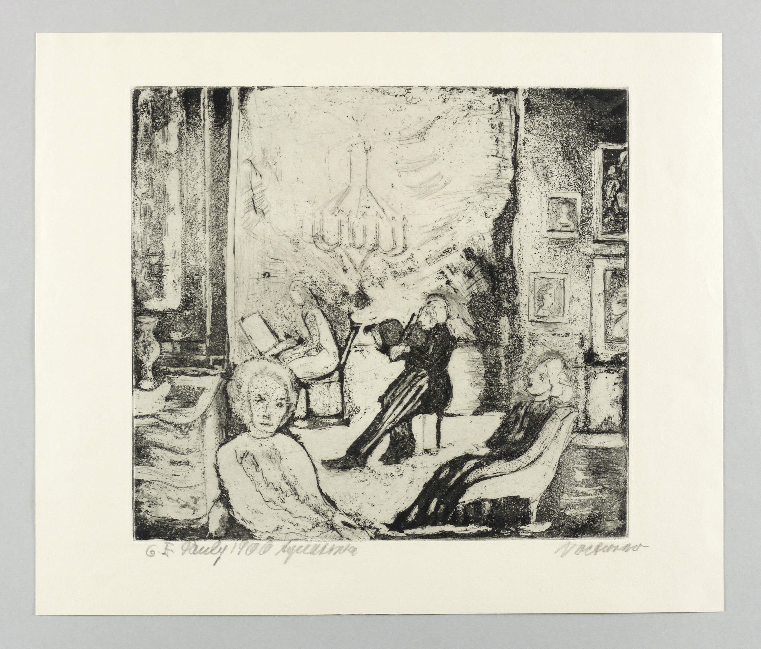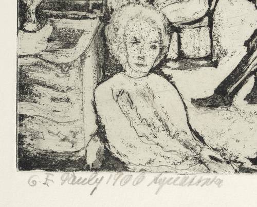 1966. Radierung / Aquatinta & Kaltnadel, in Schwarz, auf hellem Kupferdruckkarton. – Originale Künstlergrafik, von Charlotte Elfriede Pauly. – 27,9 x 30,5 cm (Darstellung / Platte), 36 x 42 cm (Blatt).
