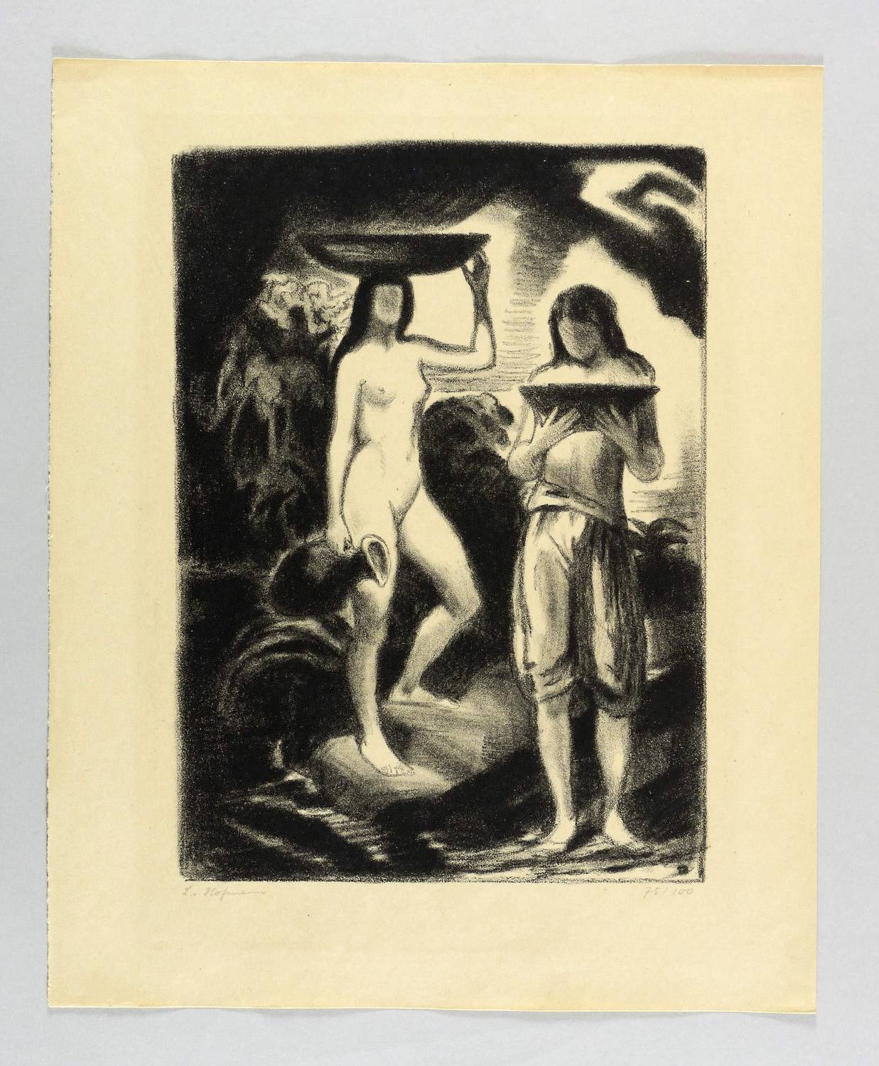 1921. Lithografie / Kreide- & Pinsellithografie, in Schwarz, auf gelbem Velin. – Originale Künstlergrafik, von Ludwig von Hofmann. – Auflage Exemplar Nr. 75/100. – 35,5 x 25,2 cm (Darstellung / Druckbild), 45 x 37 cm (Blatt).