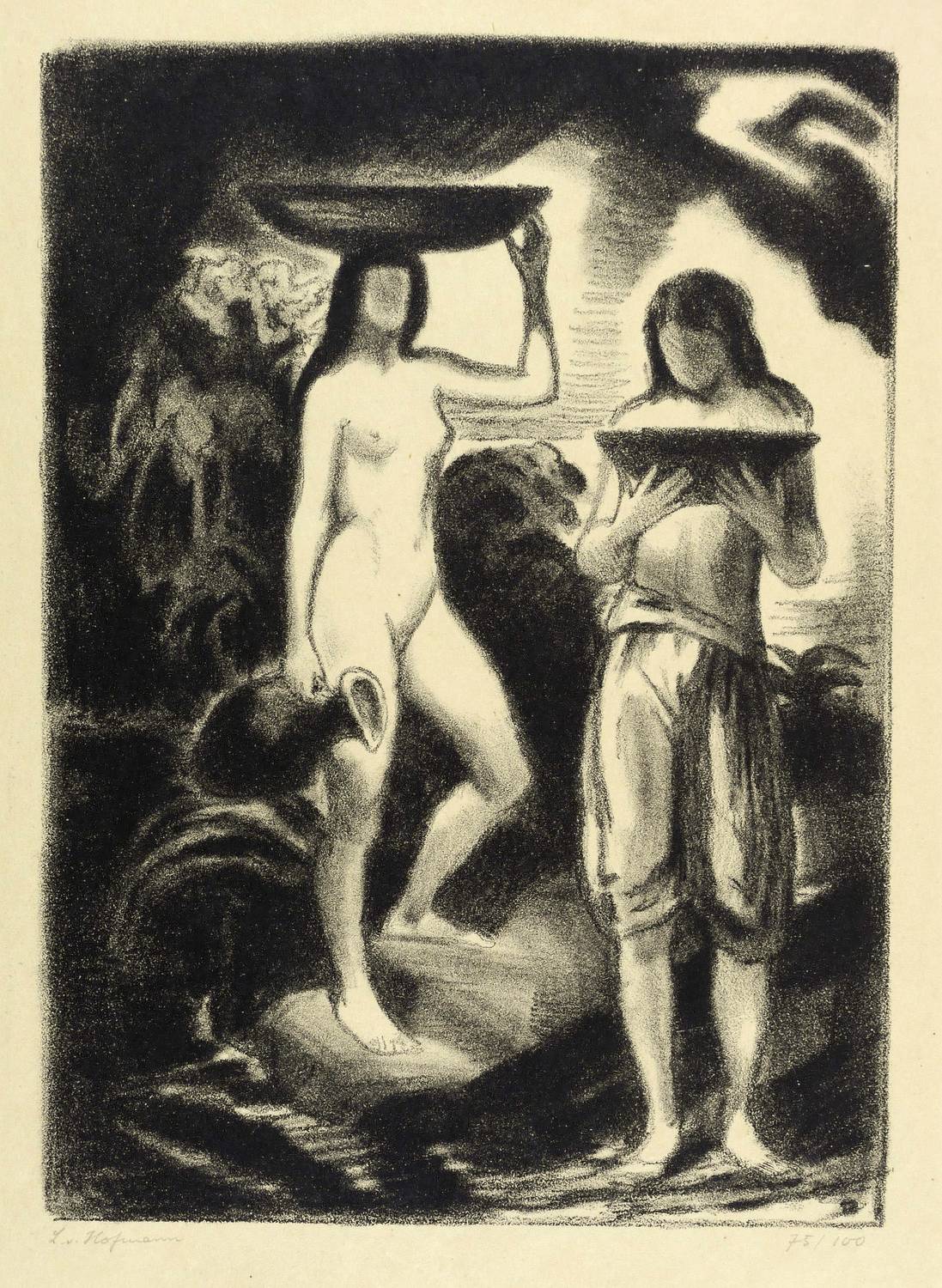 Aus: Ludwig von Hofmann, Rhythmen. Zehn Steinzeichnungen (Leipzig: Graphischer Verlag Friedrich Dehne 1921). – Links unten in Bleistift signiert. Rechts Auflagenbezeichnung. – Druck der Akademie für Kunstgewerbe in Dresden, unter Aufsicht Ludwig von Hofmanns. – Minimale Lagerspuren. Sehr guter Zustand.
