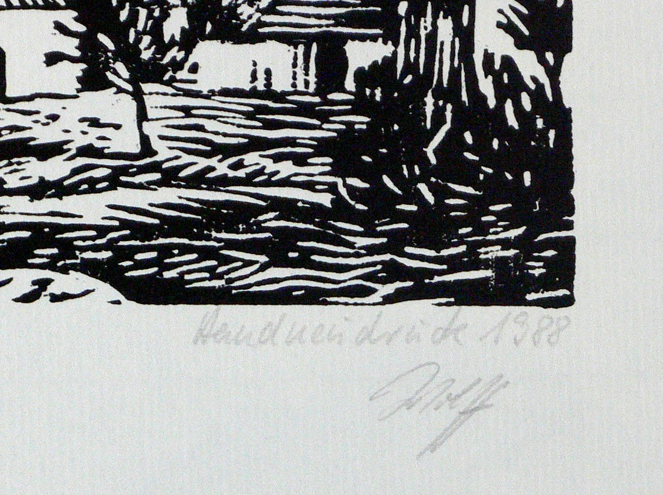 1988. Holzschnitt, in Schwarz, auf Maschinenbütten. – Originale Künstlergrafik, von Willy Wolff. – Auflage Exemplar Nr. 50/50. – 15,3 x 19,6 cm (Darstellung / Druckstock), 38 x 45 cm (Blatt).